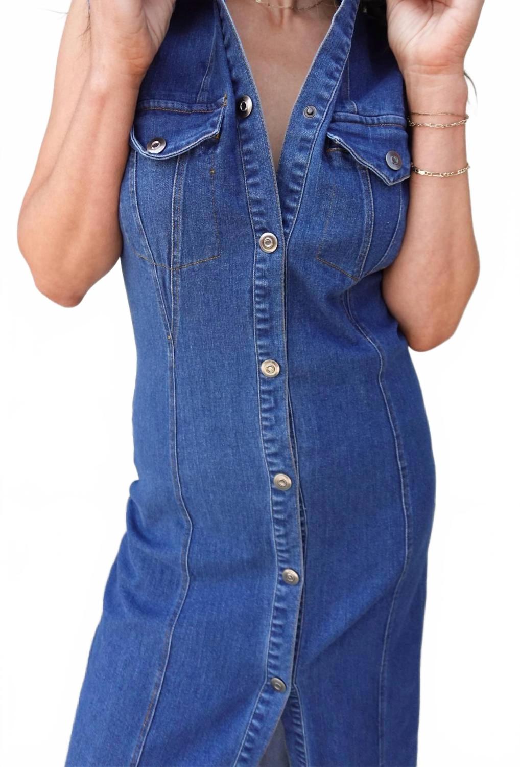 Платье миди настолько универсально, что ваши варианты его ношения безграничны. Откройте для себя платье миди So Me Button-front - вневременную модель из классического темного денима, воплощающую непринужденный стиль. Это платье без рукавов с воротником и функциональными нагрудными карманами идеально подходит для создания элегантного и практичного образа. Благодаря застежке на пуговицы и латунной фурнитуре, оно удобно для кормящих мам и идеально подходит для возрождения моды 90-х. Структурированный силуэт облегает талию и бедра, обеспечивая комфорт, а разрез спереди не стесняет движений.