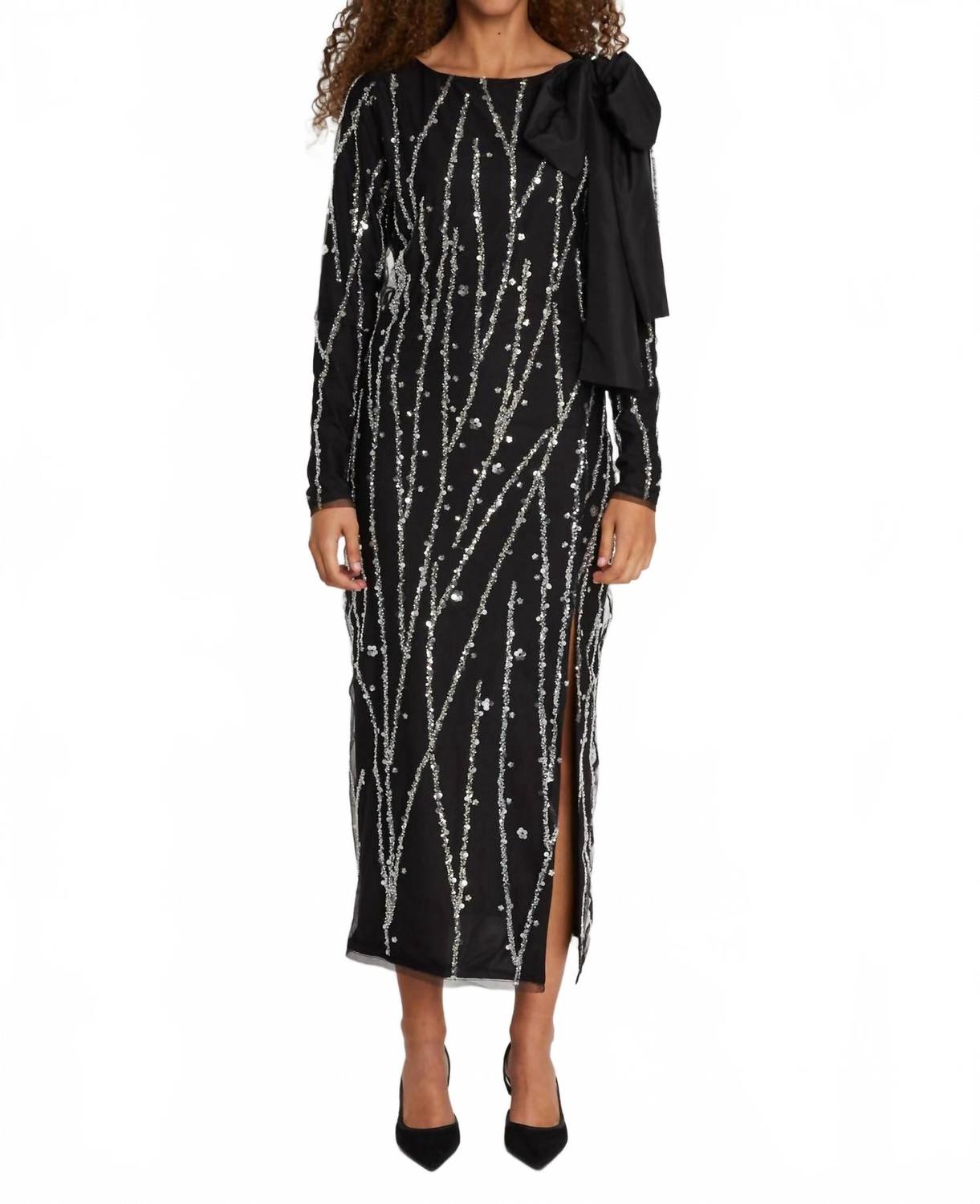 Это гламурное платье изготовлено из смеси 90% полиэстера и 10% ПЭТ, которая благодаря сплошной отделке пайетками придает ему структуру и блеск. Платье прямого кроя с легким кроем имеет длинные рукава, высокий разрез спереди и молнию сзади для удобства надевания. Съемный бант добавляет индивидуальности: наденьте его для создания более эффектного образа или снимите для более минималистичного. Полностью на подкладке для комфорта, это платье идеально подходит для праздников и особых случаев, сочетая элегантность и универсальный стиль.