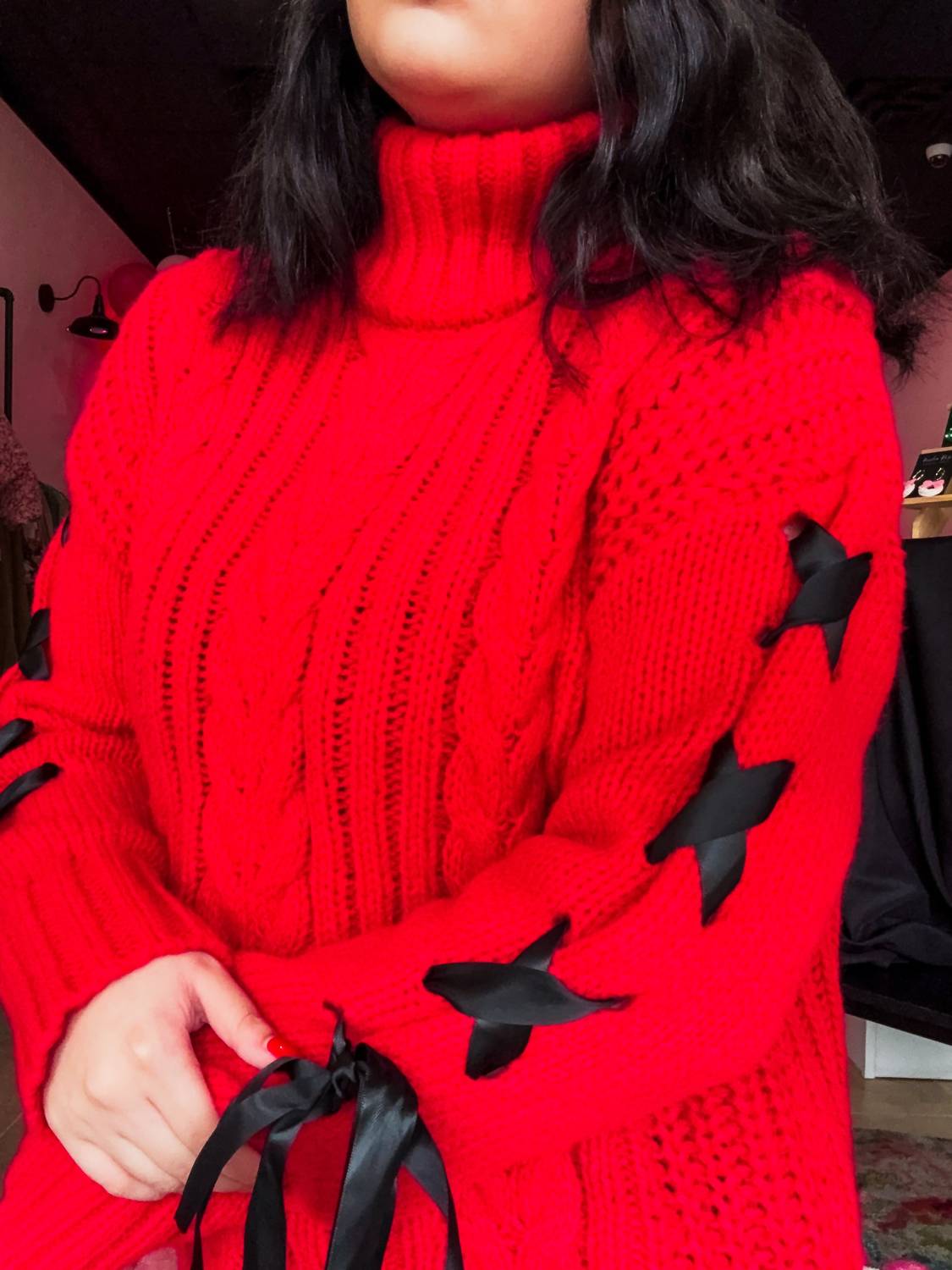 Свободное и элегантное платье, которое вы будете носить круглый год. Представляем трикотажное платье Be My Sweetheart Cable Knit Dress от PROMESA - прекрасный выбор для уютного свидания. Это мини-платье красного цвета с длинными рукавами, украшенными черными бантами из лент, и стильным воротником-стойкой выполнено из 100% полиэстера, что обеспечивает слегка свободный крой. Платье удобно носить благодаря застежке-липучке, что делает его идеальным для максималистской осенней моды. Чтобы сохранить его очарование, просто стирайте вручную в холодной воде. На модели размер S (рост 160 см).