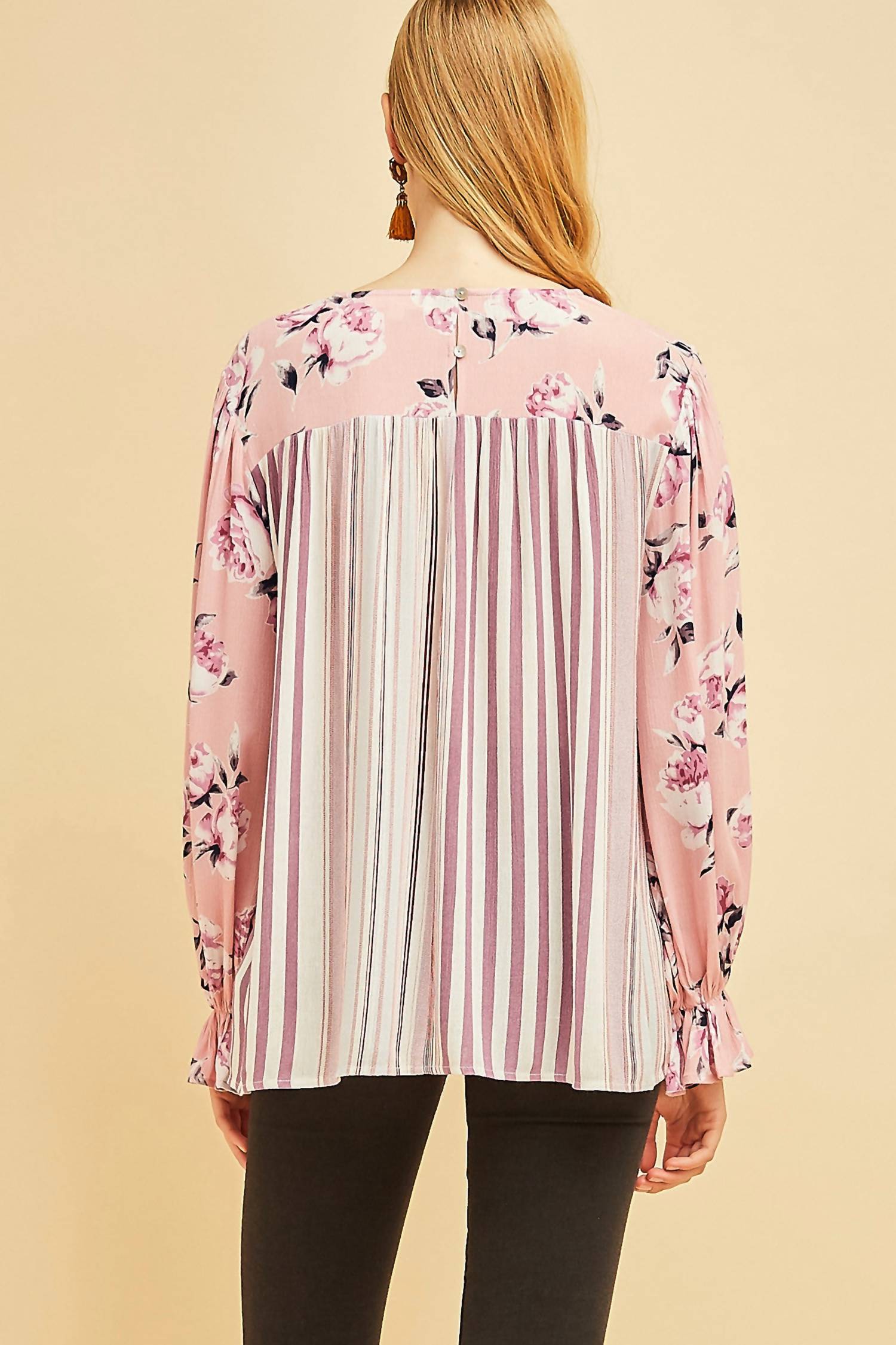 Добавьте изысканности в свой гардероб с блузкой Entro Mixed Print Blouse очаровательного нежно-розового оттенка, идеально подходящей для любой поклонницы стиля бохо. Этот топ с длинными рукавами может похвастаться восхитительным сочетанием цветочных и полосатых принтов, а эластичные рукава-фонарики придают образу еще больше изысканности. Изготовленная из легкого 100% вискозы, она имеет шикарный овальный вырез и практичную застежку-капельку на пуговицу сзади. Для ухода используйте химчистку или ручную стирку.