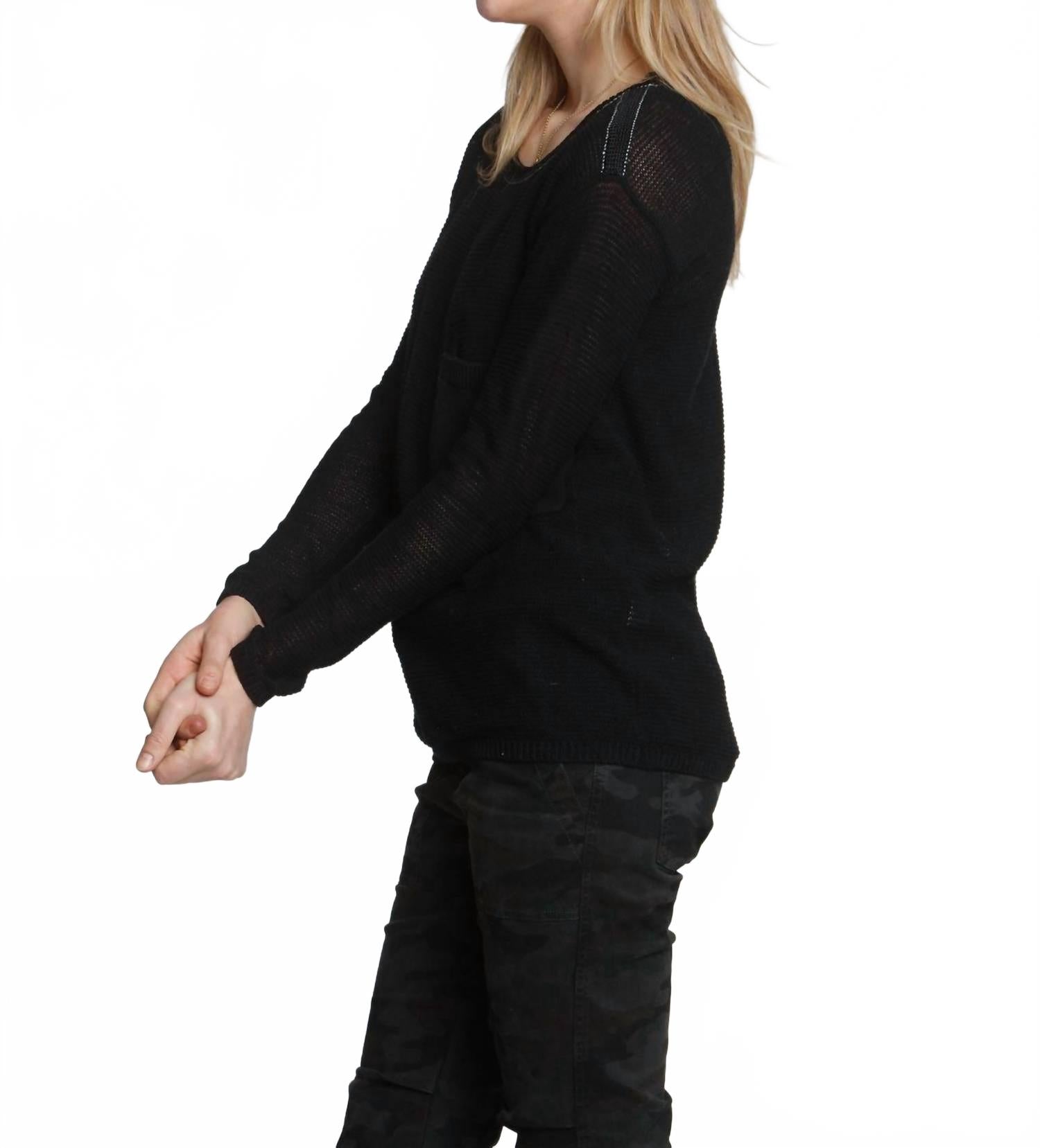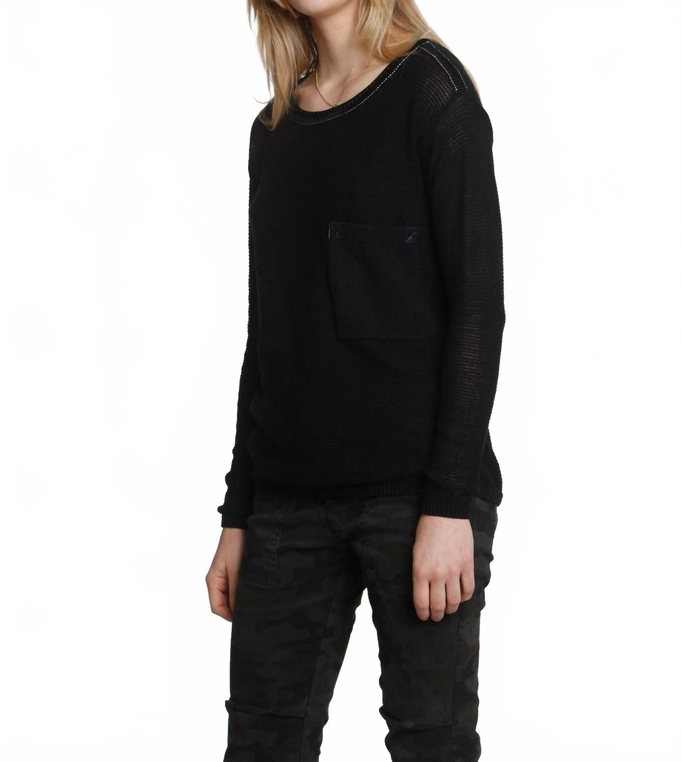Идеальная футболка с длинным рукавом, которая сочетается практически с чем угодно. Женская футболка Frankie Pocket Crew от LABEL+thread - стильная однотонная модель, идеально подходящая для осенних мероприятий. Длинные рукава и округлый вырез горловины с блестящей вискозной отделкой придают элегантность однотонной черной хлопковой сетке. Эта модель без застежки дополнена кожаными хлястиками на кармане на уровне бедра, гармонично сочетая повседневный и роскошный стиль. Для сохранения качества изделия рекомендуется сдавать его в химчистку или сушить на горизонтальной поверхности.