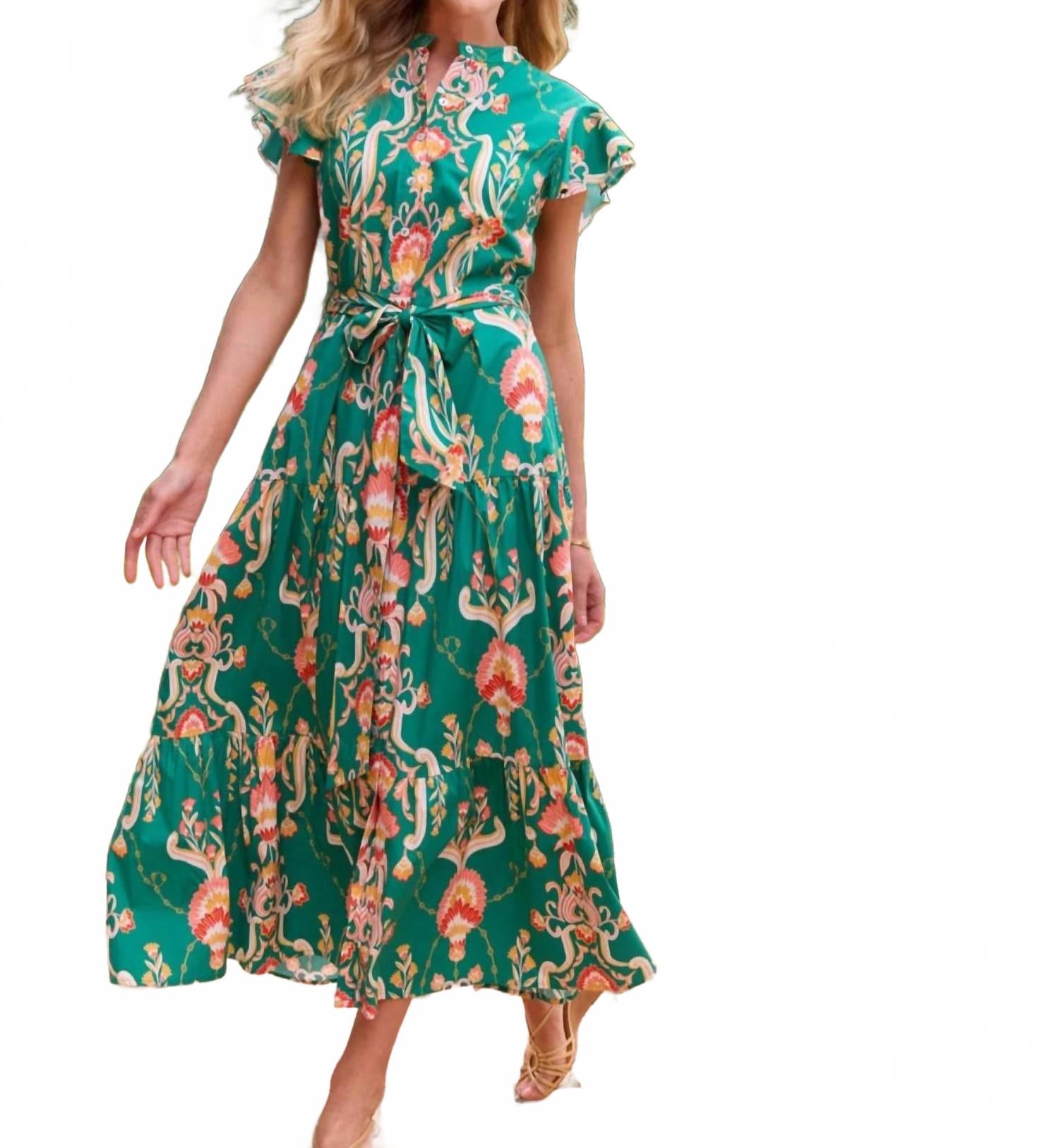 Платье макси Mirabella от Jude Connally - одновременно и милое, и удобное. Представляем макси-платье Mirabella от Jude Connally - шедевр гобеленового зеленого цвета, гармонично сочетающий стиль и практичность. Это платье облегающего кроя с V-образным вырезом, короткими рукавами-крылышками и удобными карманами, выгодно подчеркивает фигуру. Платье изготовлено из хлопкового эластичного поплина в Индии, а его изысканный ручной принт добавляет ему неповторимой привлекательности. Уход прост: машинная стирка и сушка в разложенном виде; избегать отбеливания и сушки в стиральной машине.