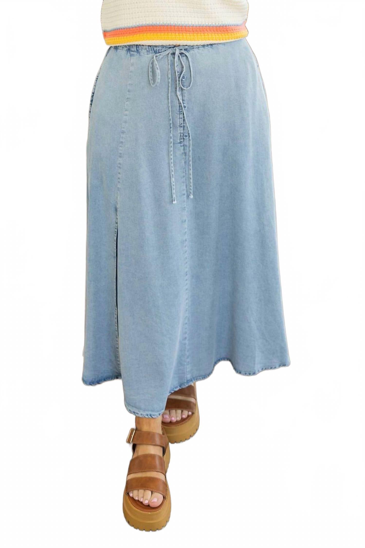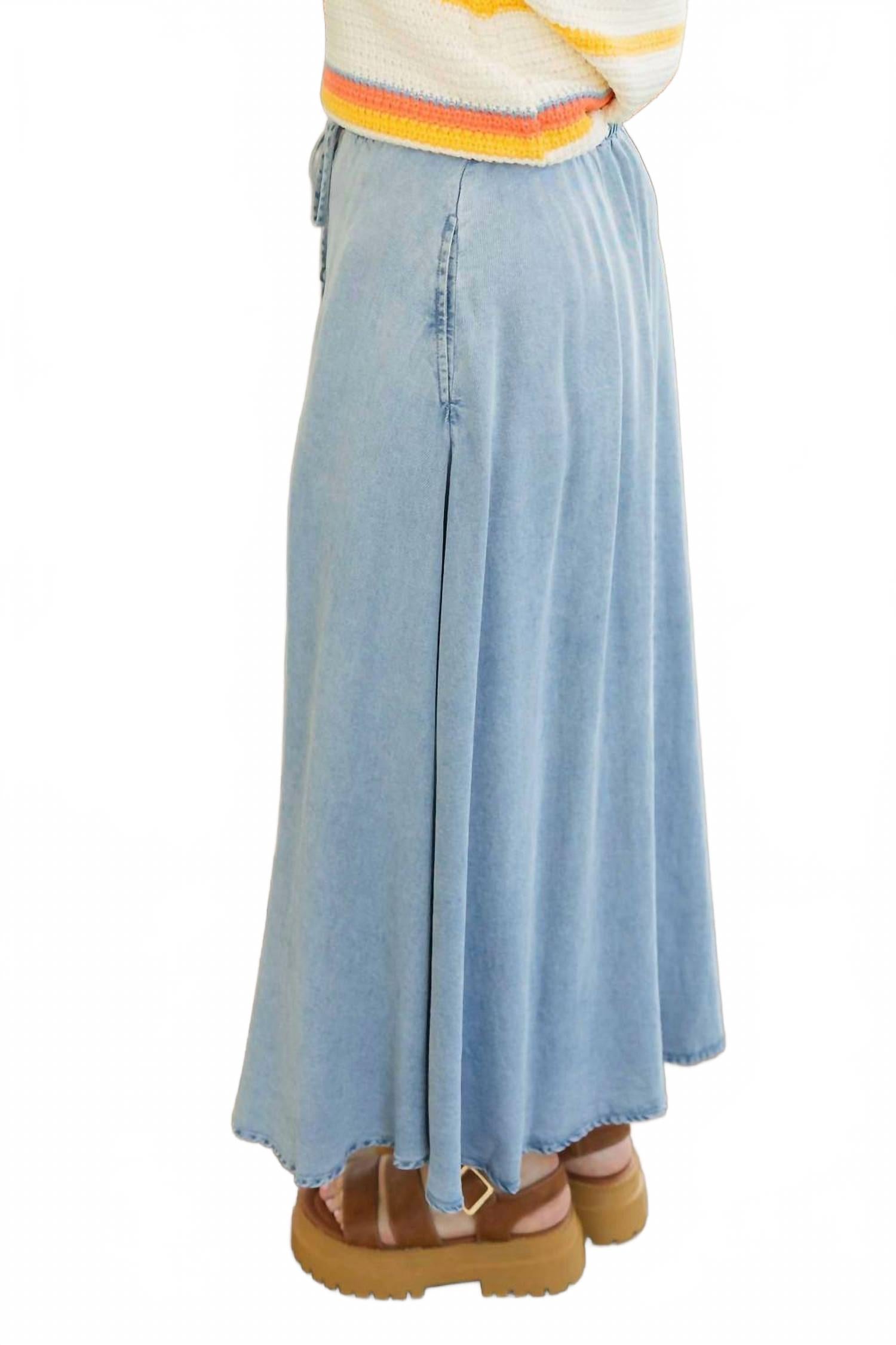 Заправьте любимую футболку в эту юбку миди, чтобы создать непринужденный и стильный образ. Откройте для себя джинсовую юбку миди Jayla от EN CREME - шикарное сочетание повседневного и элегантного стиля, идеально подходящее для любого гардероба. Эта синяя юбка свободного кроя с эластичным поясом, завязывающимся поясом и удобными карманами выполнена из 100% лиоцелла. А-образный силуэт и застежка на пуговицы добавляют изысканности, а боковые разрезы обеспечивают свободу движений. Идеально подходит для весенних каникул и проста в уходе: машинная стирка и сушка в стиральной машине.