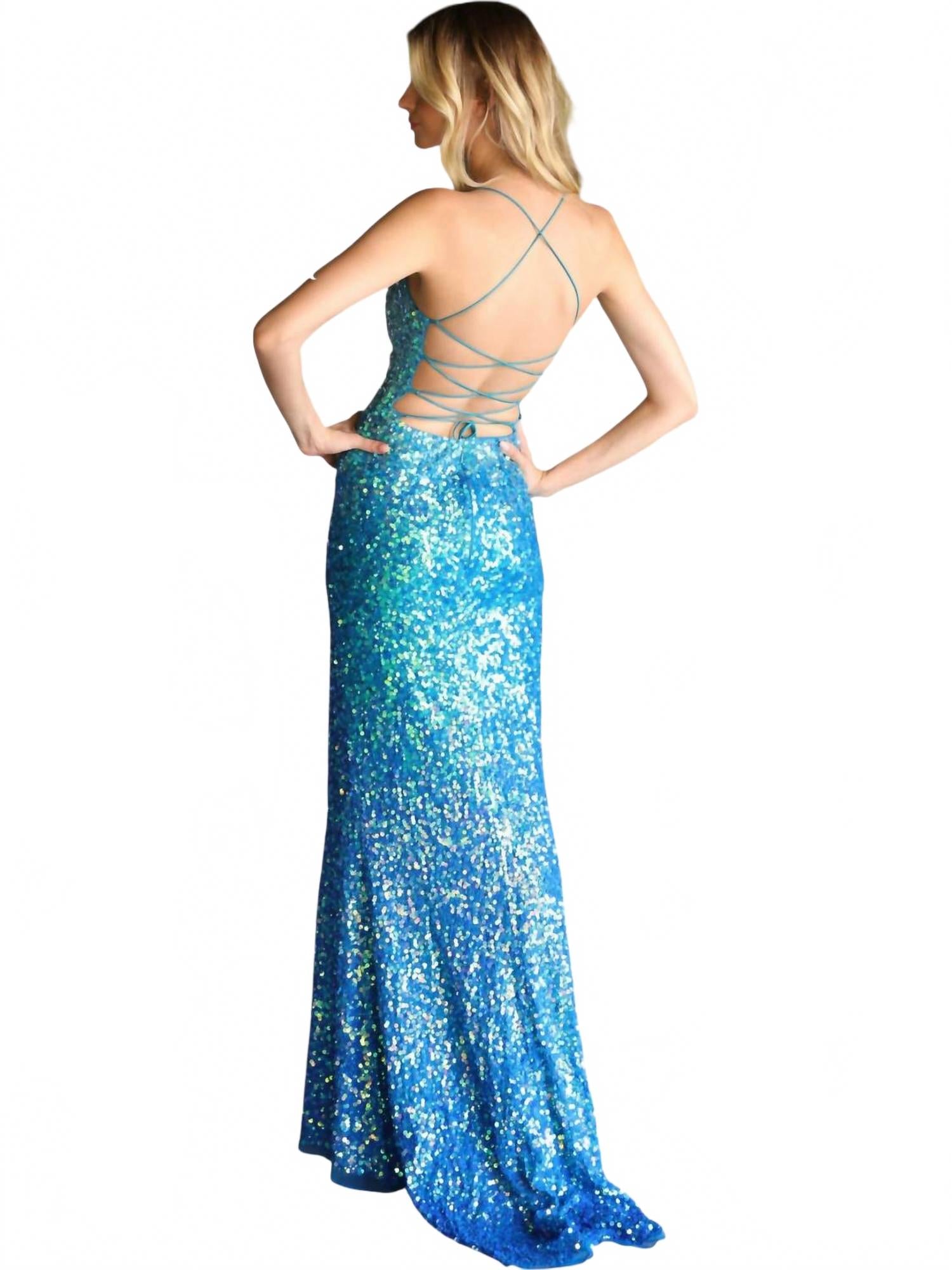 Это платье, выполненное в пленительном павлиньем цвете и украшенное ослепительными пайетками с эффектом омбре, отличается облегающим силуэтом А-силуэта и тонкими бретельками, создающими изысканный образ. Длинное платье отличается стильным высоким разрезом сбоку и соблазнительной открытой спиной со шнуровкой, дополненной застежкой-молнией. Это платье с круглым вырезом идеально подходит для выпускного вечера и обеспечит вам сияние на протяжении всего вечера.