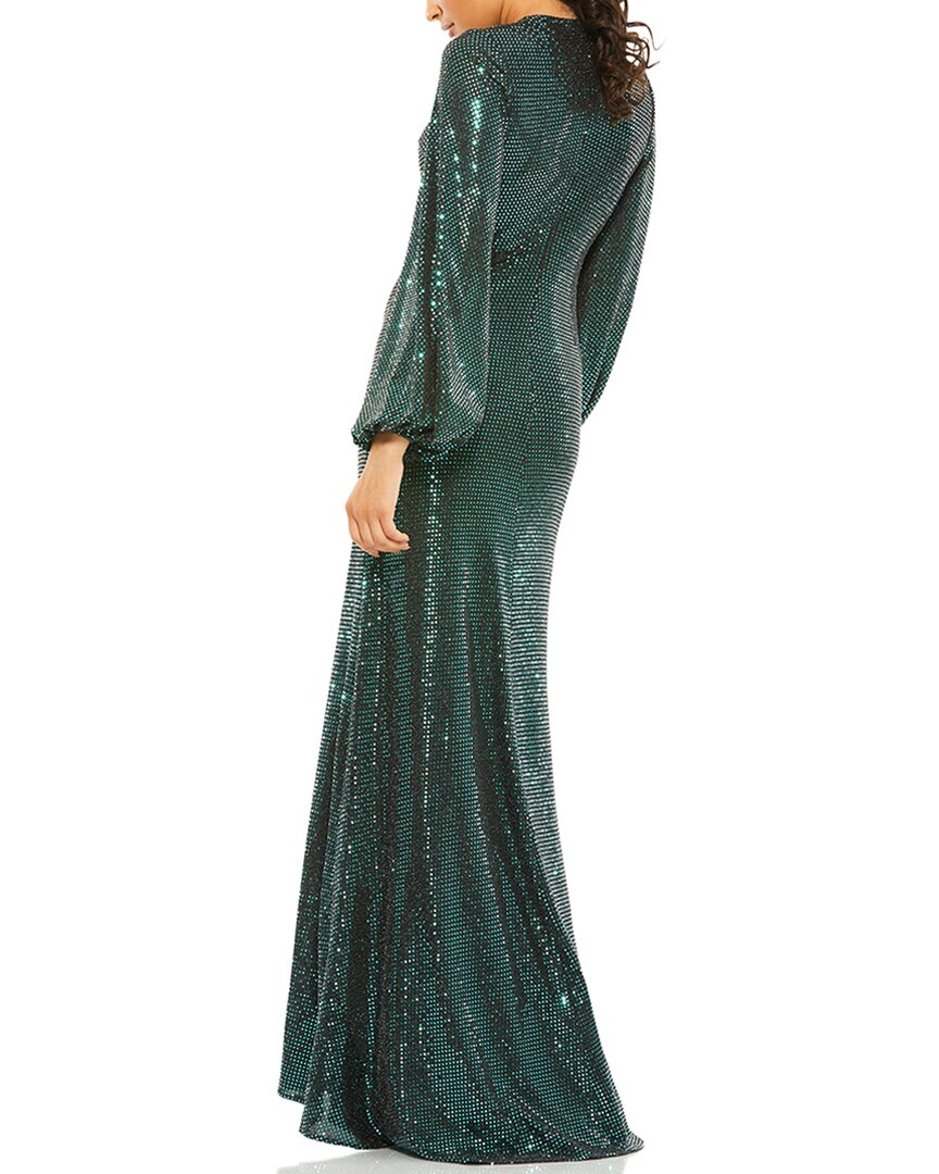 Представляем элегантное платье Mac Duggal Trumpet Gown потрясающего бутылочно-зеленого цвета. Это изысканное платье с высоким воротом, длинными рукавами-бишоп и изысканной отделкой пайетками по всей длине. Платье изготовлено из 100% полиэстера, длина от плеча до подола составляет около 155 см. Центральная молния сзади обеспечивает идеальную посадку, а рекомендации по уходу, предусматривающие только локальную чистку, делают уход легким и легким. Изготовлено импортным способом и создано для современной женщины, которая хочет произвести впечатление на любом особом мероприятии.