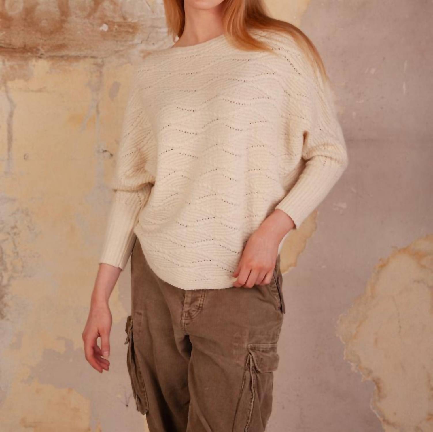 Этот топ цвета экрю с рукавами «летучая мышь» длиной три четверти и вырезом-лодочкой, подчеркнутым объемным узором в виде ромбовидных листьев в стиле ар-нуво. Изготовленный из смеси 6% шерсти, 50% переработанного полиэстера, 29% нейлона и 15% полиэстера, этот топ отличается экологичностью и изысканностью. Надевайте. Стирайте вручную и сушите на горизонтальной поверхности.