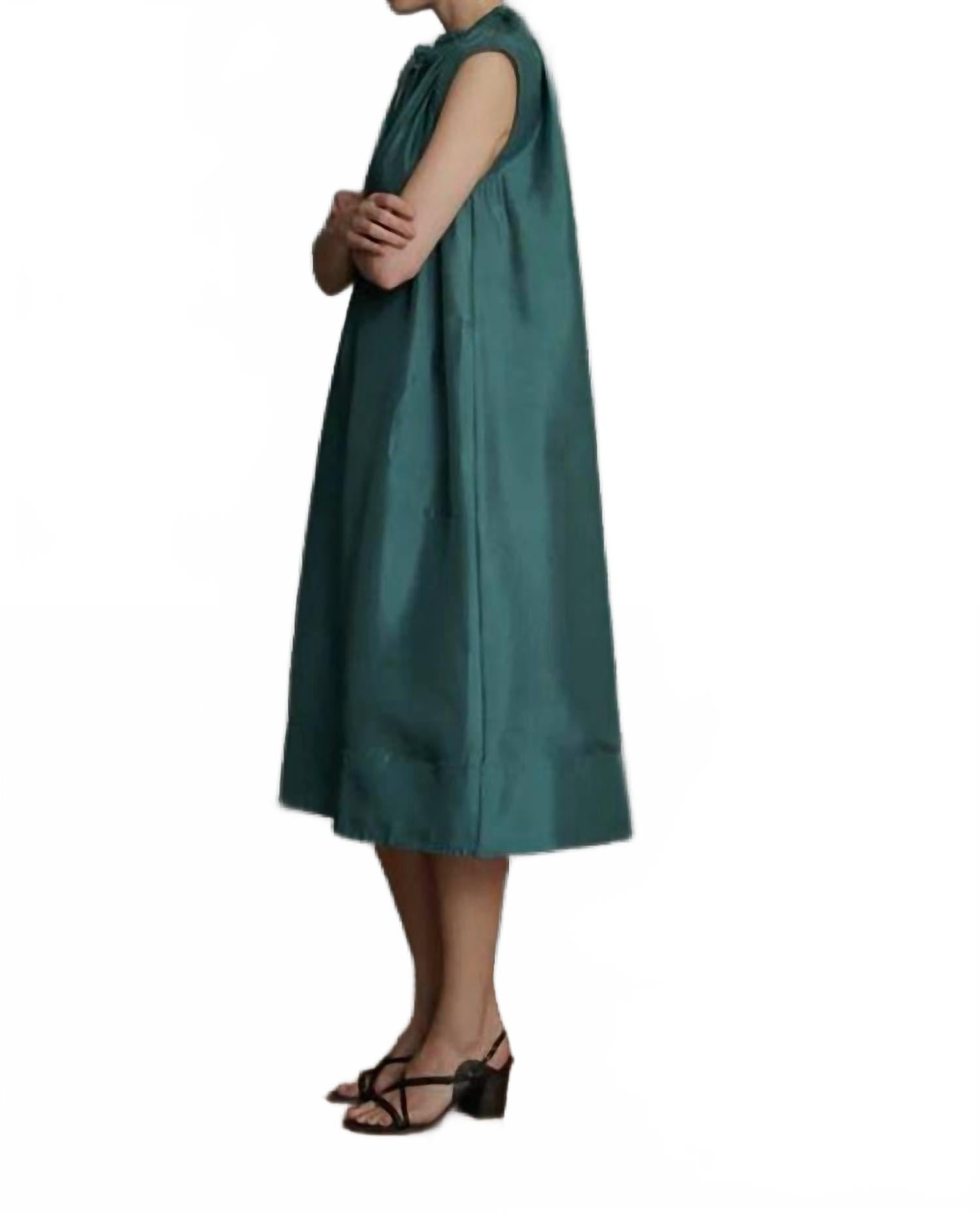 Платье идеальной длины существует. Представляем платье Tamaris от Soeur - потрясающее изделие из роскошного шелка-дупион очаровательного оттенка Vert Canard. Это платье миди без рукавов имеет присборенный овальный вырез, дополненный регулируемой завязкой для индивидуальной посадки и комфорта. Платье имеет свободный силуэт, подходящий для самых разных форм, с практичными карманами и тонким разрезом посередине для большей свободы движений. Идеально подходит для летних случаев, а мерцающий однотонный узор добавит нотку минималистичной элегантности вашему гардеробу для отпуска.
