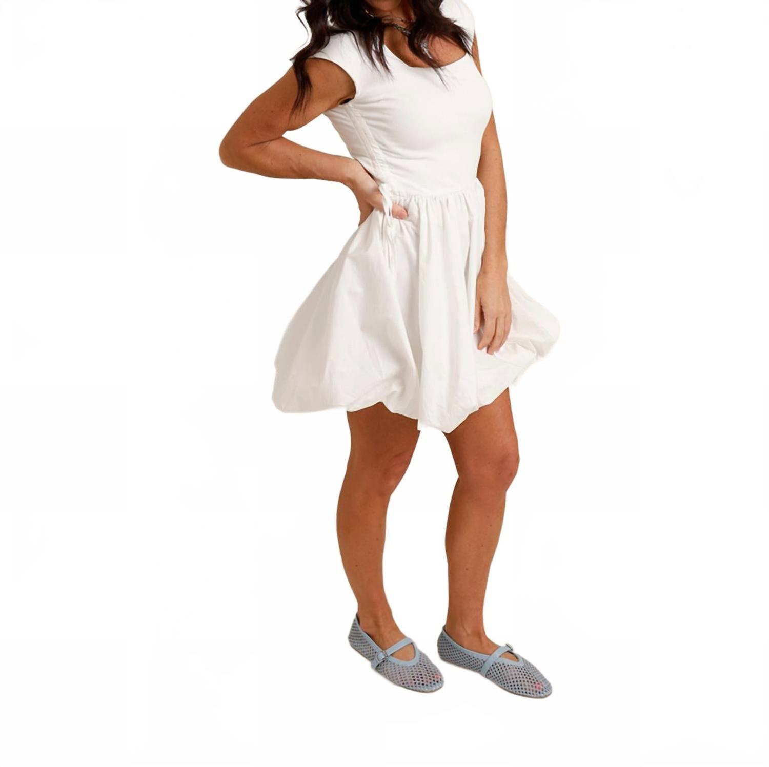 Короткое и воздушное платье для теплых дней. Представляем мини-платье Head In The Clouds Bubble Hem от Sofie the Label - идеальный выбор для любого радостного летнего случая. Это платье без рукавов изготовлено из смеси 95% хлопка и 5% спандекса. Оно облегает и расклешается, а игривый подолом-пузырьком. Чистый белый цвет дополняет округлый вырез и регулируемую резинку сбоку, идеально добавляя элегантности вашему образу. Уход за этим изделием на подкладке: ручная стирка в холодной воде, сушка на веревке и глажка при необходимости, что гарантирует ему место в вашем гардеробе.