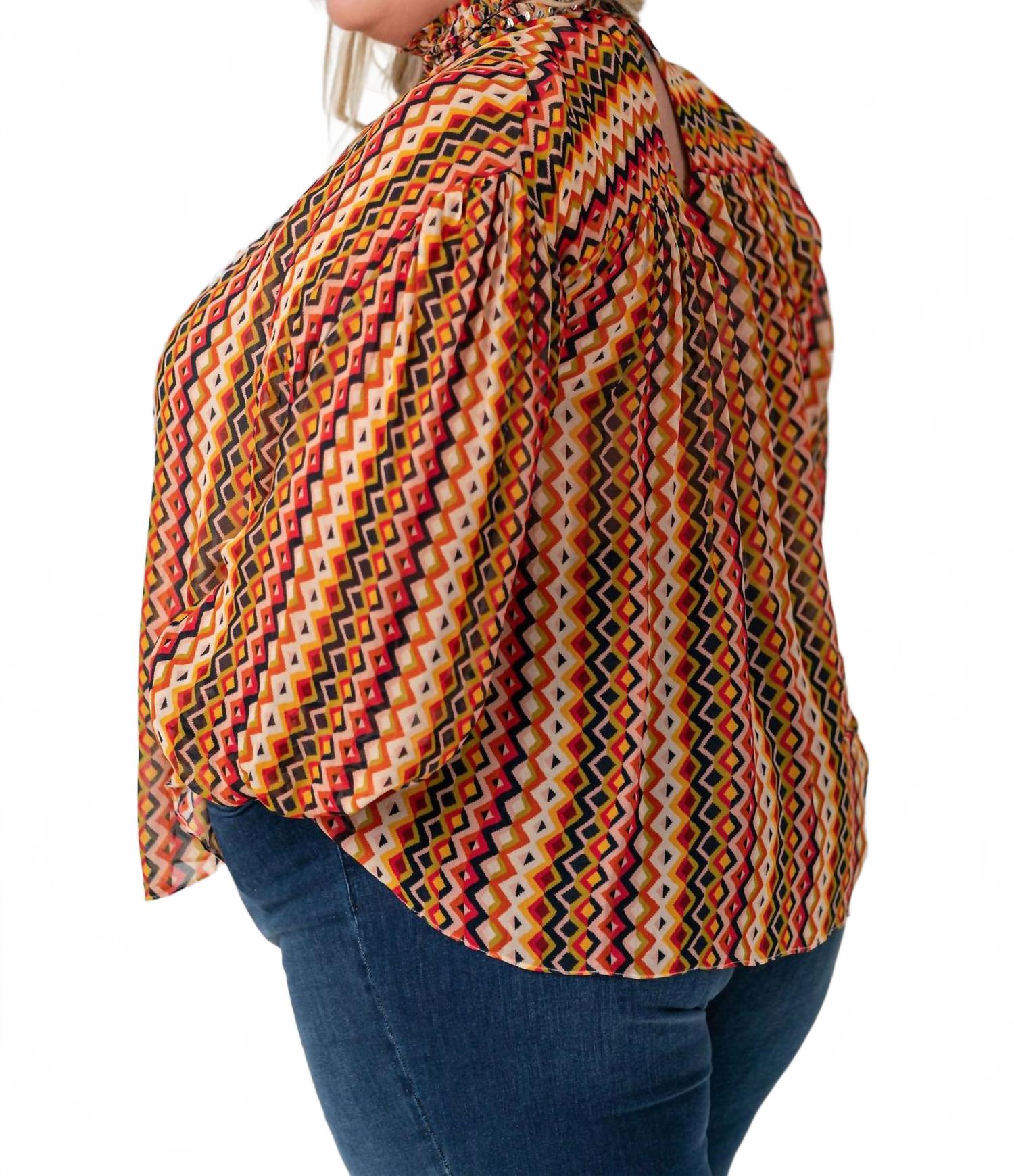 Универсальная блузка, которая подойдет и для работы, и для ужина! Представляем блузку Verb Barbara - романтичное и богемное изделие, созданное с использованием изысканных деталей индийскими мастерами. Этот узорчатый топ из роскошной вискозы создан для женщин plus size. Изящный воротник-стойка и длинные рукава обеспечивают легкость и элегантность благодаря застежке на липучке. Уход: только химчистка. Эта блузка идеально подходит для праздничных вечеринок или торжественных случаев, она станет незаменимой вещью в любой сезон, к которой вы будете возвращаться снова и снова.