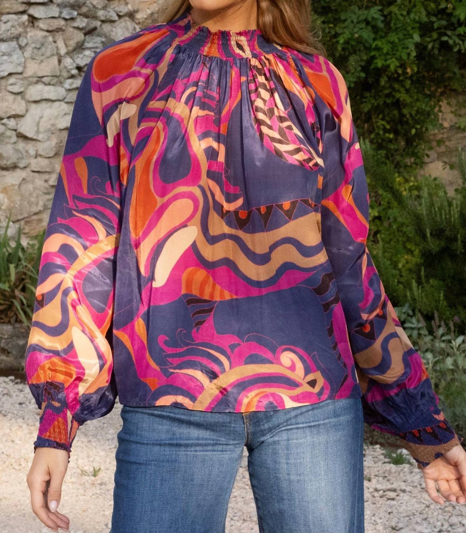 Блузка, которая никогда не выйдет из моды. Украсьте свой гардероб блузкой Oliphant High Neck в цвете Arabia Navy, которая станет шикарным дополнением к любой коллекции. Эта блузка из роскошного смесового шелка отличается длинными рукавами-фонариками, элегантными присборенными манжетами и изысканным высоким воротом с присборенными рукавами и застежкой на пуговицы. Узор создает интересный визуальный эффект, а воротник-стойка дополняет ее винтажный шарм. Уход: Сухая чистка или ручная стирка в холодной воде. Сушить на горизонтальной поверхности или в подвешенном состоянии.