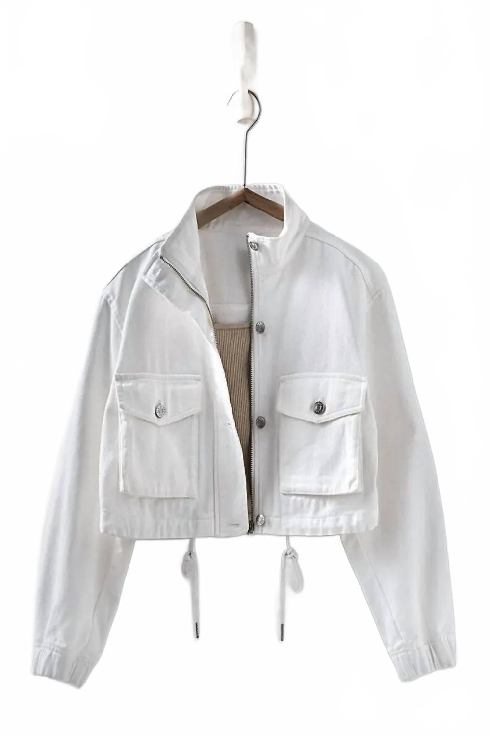 Идеальная джинсовая куртка для прохладных межсезонных дней. Представляем укороченную джинсовую куртку Utility от Urban Daizy - незаменимый предмет гардероба для любого современного человека. Эта женская куртка с длинными рукавами, застежкой на пуговицы и модным воротником-стойкой создаст шикарный образ для весеннего сезона. Изготовлена ​​из однотонного белого денима и оснащена функциональными карманами, которые гармонично сочетают стиль и практичность. Куртка проста в уходе благодаря машинной стирке, что делает ее идеальным выбором для путешествий и повседневной носки.