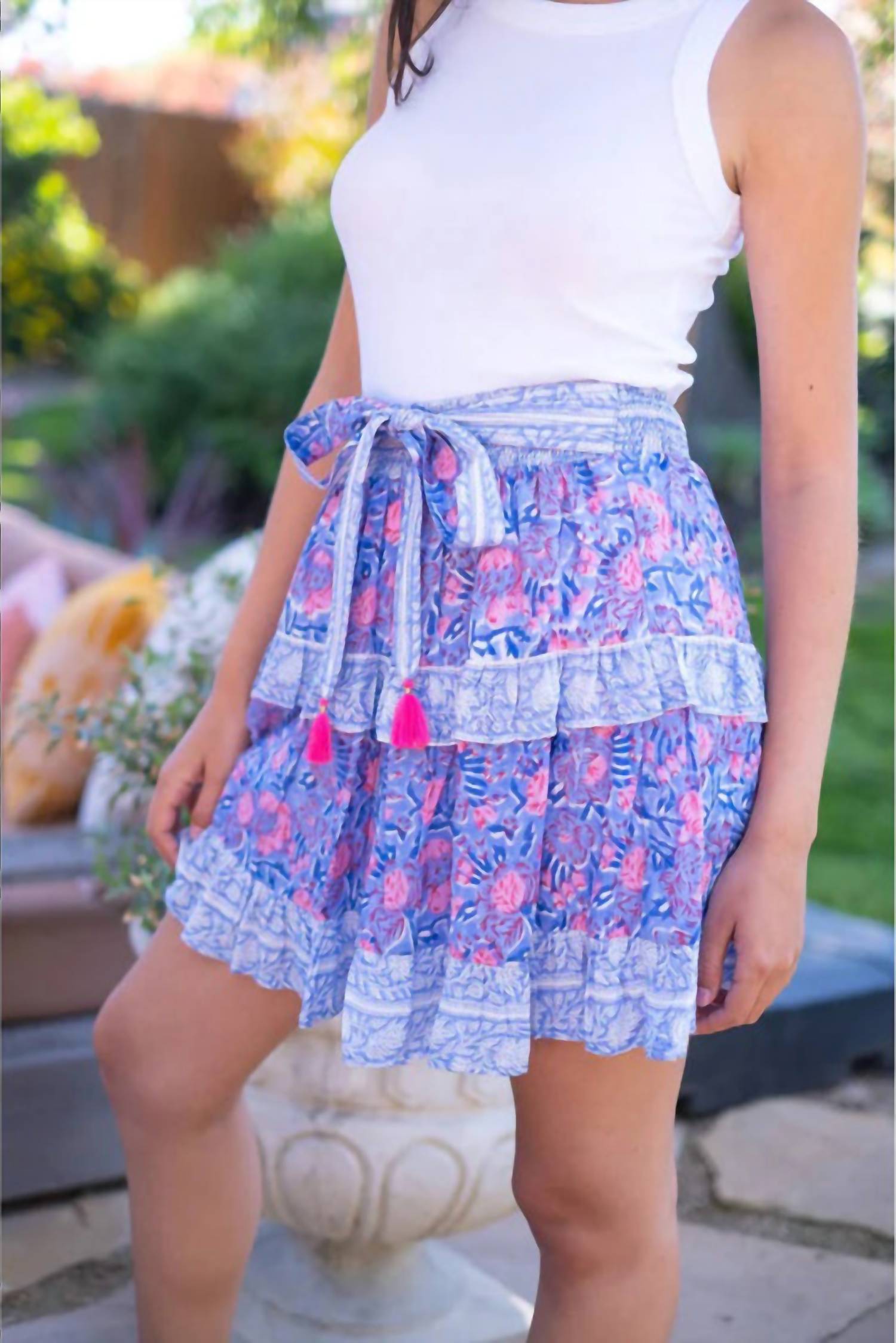 Заправьте любимую футболку, чтобы создать более непринужденный образ. Дополните свой отпускной гардероб юбкой BELL Blake - шедевром в стиле бохо-шик в синих и розовых тонах. Эта мини-юбка изготовлена ​​из 80% хлопка и 20% шелка, с легкой шелковой вуалью и очаровательным принтованным узором ручной работы. Эластичный пояс обеспечивает комфорт, а завязывающийся пояс с кисточками добавляет изюминку. Подкладка полностью выполнена из 100% хлопка. Юбка изготовлена ​​в Индии и отличается непринужденным стилем. Для сохранения яркого вида юбку необходимо сдавать в химчистку.