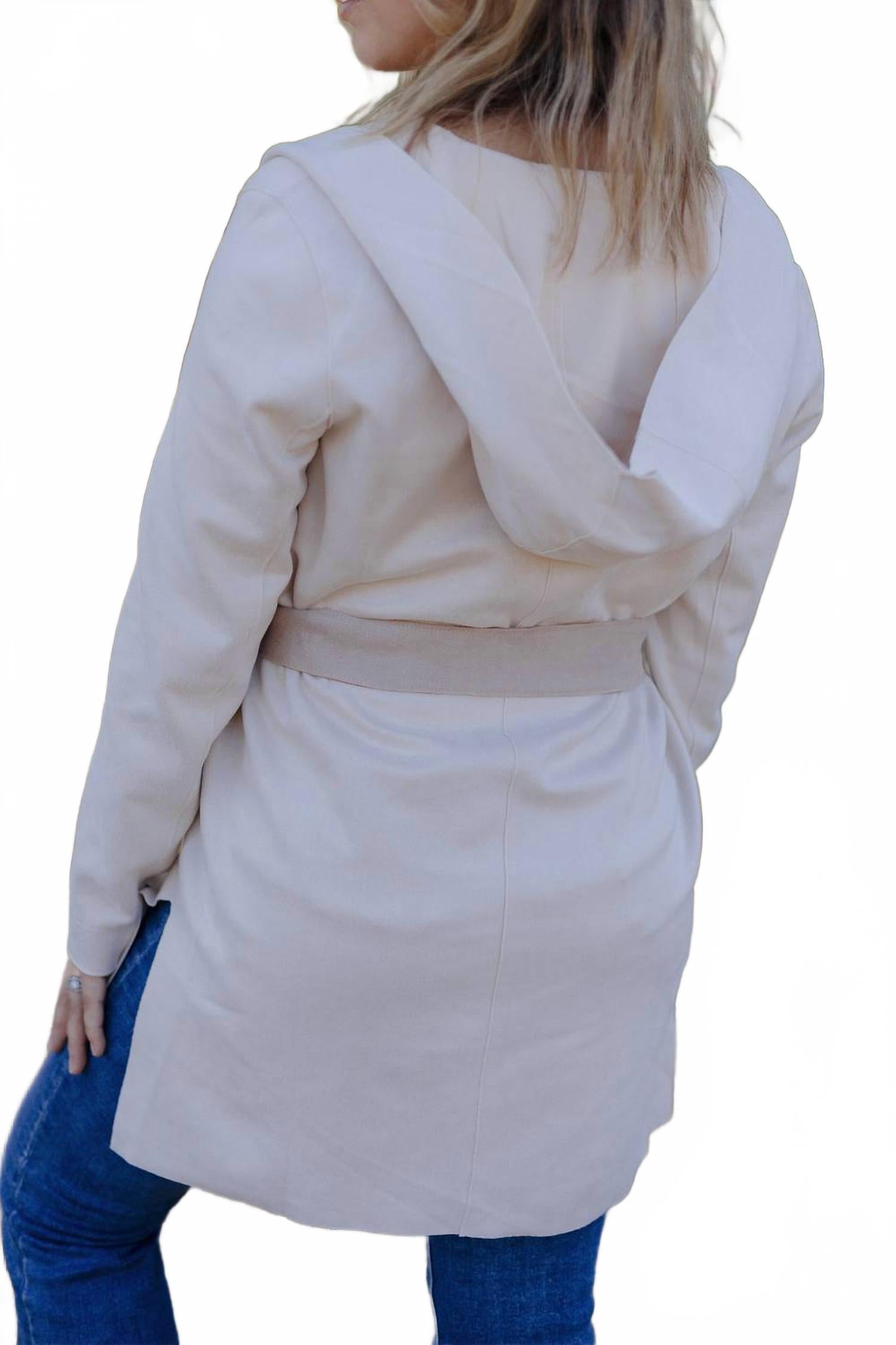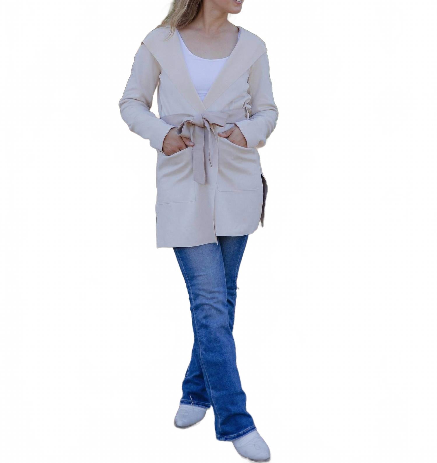Пальто с капюшоном Leah от Hem & Thread - незаменимая вещь для осенних путешествий. Однотонное бежевое пальто выполнено из легкой искусственной замши. Эта повседневная куртка с длинными рукавами и функциональным съемным поясом позволяет создавать разнообразные образы. Благодаря удобной завязке и практичным карманам, это пальто с капюшоном одновременно стильное и практичное. На Джесси размер S, что делает его идеальным дополнением к вашему образу ко Дню благодарения в стиле 90-х.