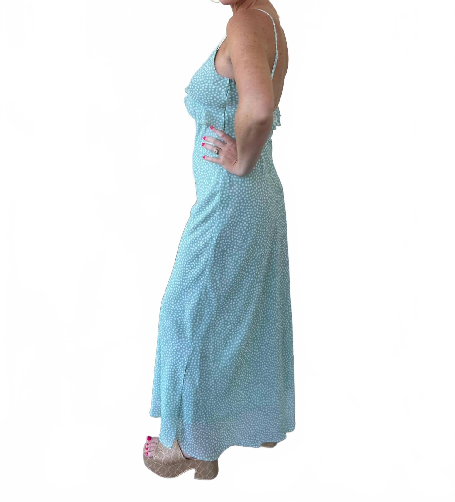 Кто не любит хорошее макси-платье? Это платье вы будете носить каждый сезон. Дополните свой летний гардероб платьем-макси Chrishell Polka Dot от INA - мятно-зеленым облегающим платьем, которое излучает игривую элегантность. Это платье без рукавов с тонкими бретельками и круглым вырезом украшено очаровательным узором в горошек и кокетливыми оборками. Регулируемые бретельки и подкладка обеспечивают удобную посадку, а завязка позволяет создать индивидуальный силуэт. Идеально подходит для отпуска или празднования Нового года. На фото Ханна в платье среднего размера.