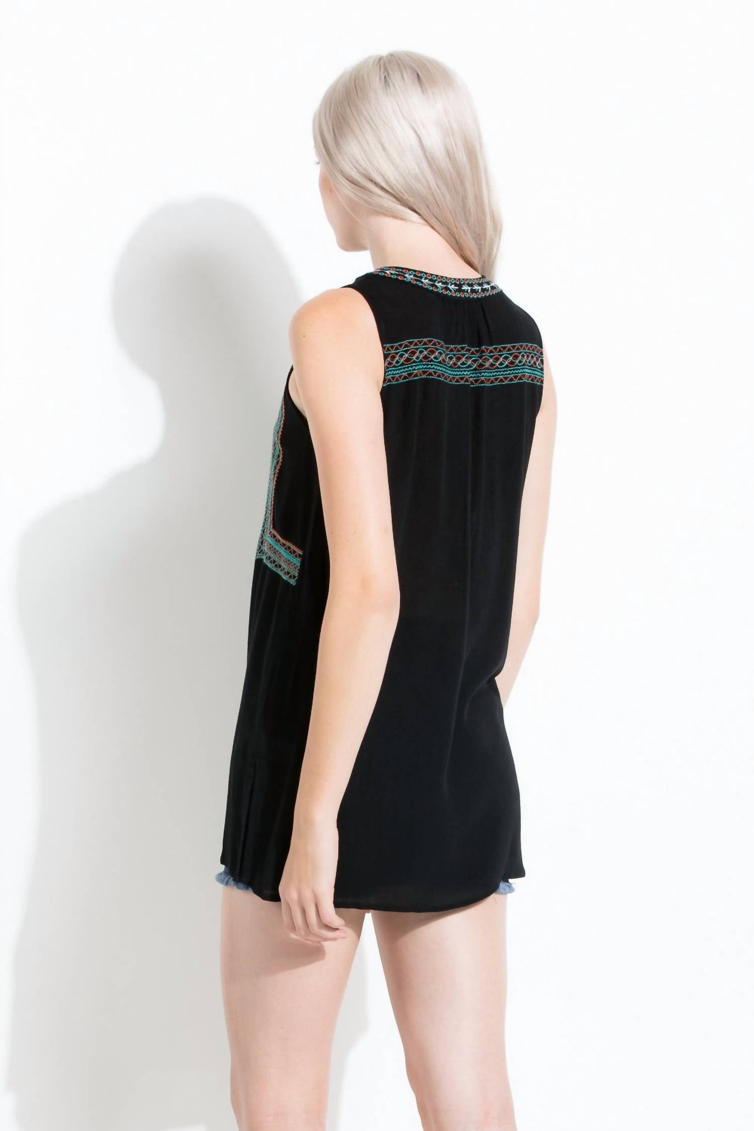 Универсальная блузка, которая подойдет как для работы, так и для ужина! Топ без рукавов с ацтекской вышивкой от THML добавит яркости любому гардеробу благодаря красочной вышивке на гладком черном фоне. Эта женская блузка отличается характерным V-образным вырезом с игривыми завязками с кисточками и удлиненной туникой, идеально подходящей к вашему любимому низу. Состав: 100% вискоза, продуманные боковые разрезы обеспечивают комфорт и свободу движений. Застежка: завязка. Топ доступен в различных размерах по обхвату груди, длина всех размеров составляет 29 дюймов.