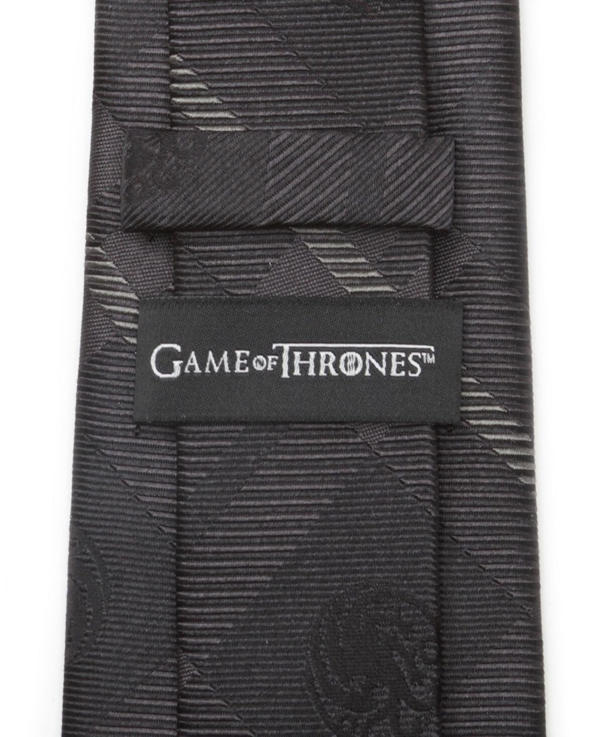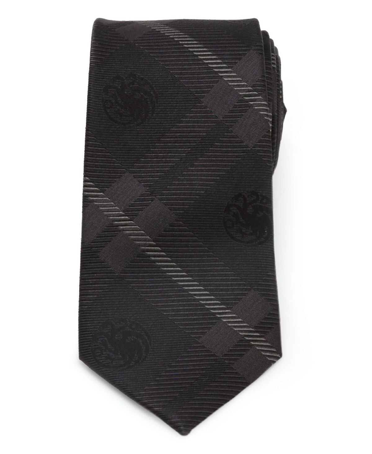 Скромный гардероб, необходимый каждому поклоннику «Игры престолов». Этот тонкий галстук сочетает в себе элегантную черно-серую клетку с символом дома Таргариенов в виде трехголового дракона, спрятанным в отдельных вставках.