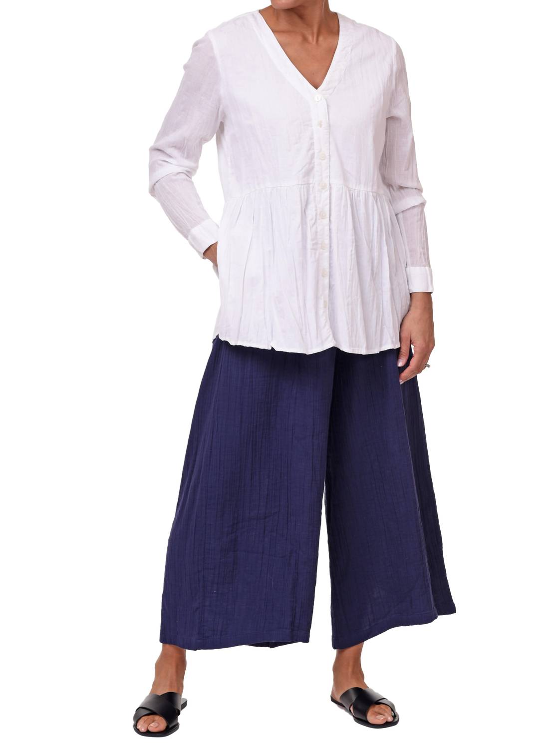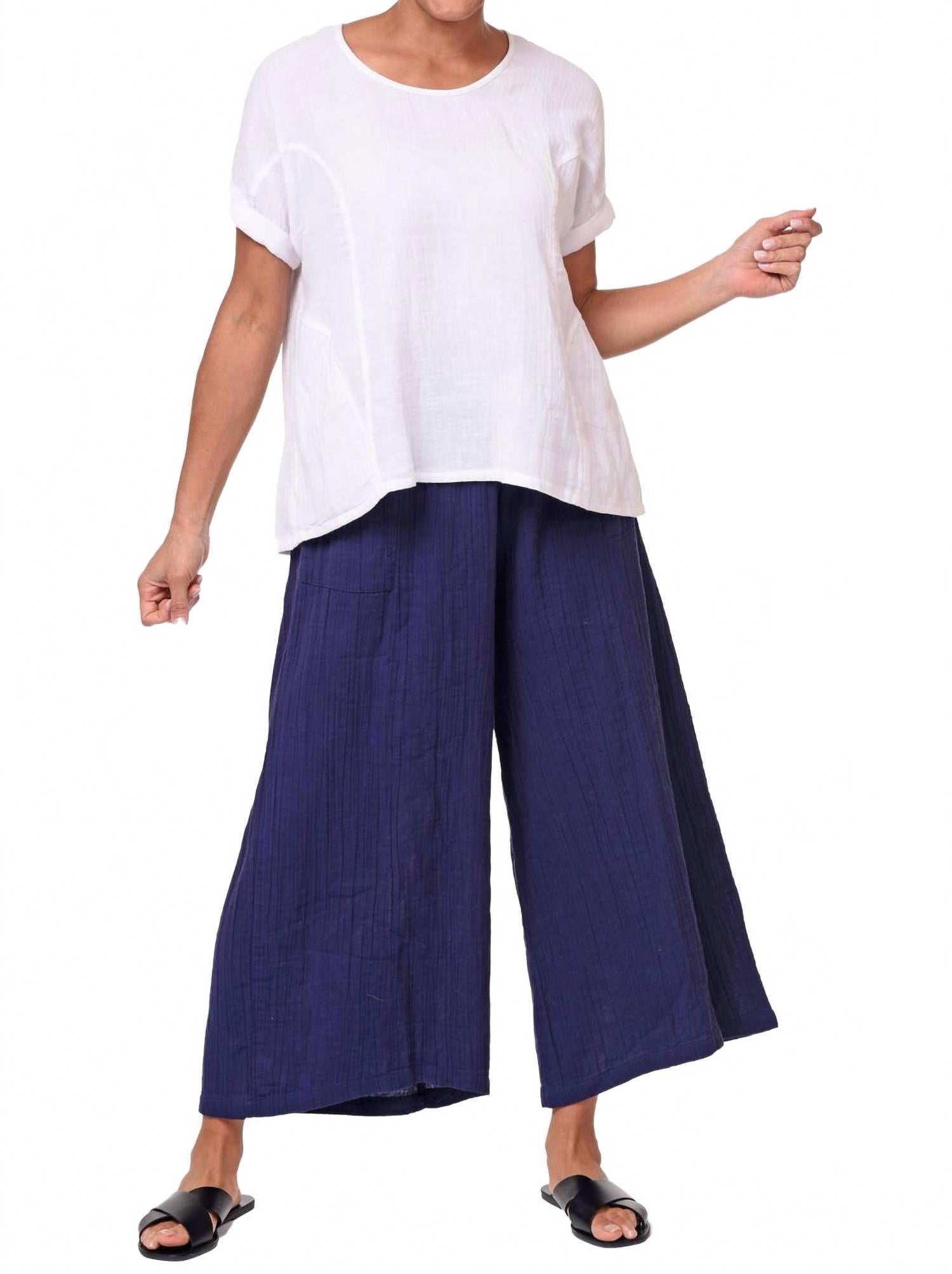 Откройте для себя брюки Palazzo от Tulip Clothing - великолепное дополнение к вашему гардеробу из фактурной хлопковой ткани темно-синего цвета. Эти брюки с высокой талией отличаются очень широким кроем, эластичным поясом и накладными карманами спереди, обеспечивая комфорт и функциональность. Они застегиваются на застежку и доступны в различных размерах: от XS (36,75 дюйма) до XXL (38 дюймов). Длина внутреннего шва составляет 24,5 дюйма для всех размеров. Уход за этой универсальной вещью прост: рекомендуем стирать в стиральной машине и сушить на веревке.