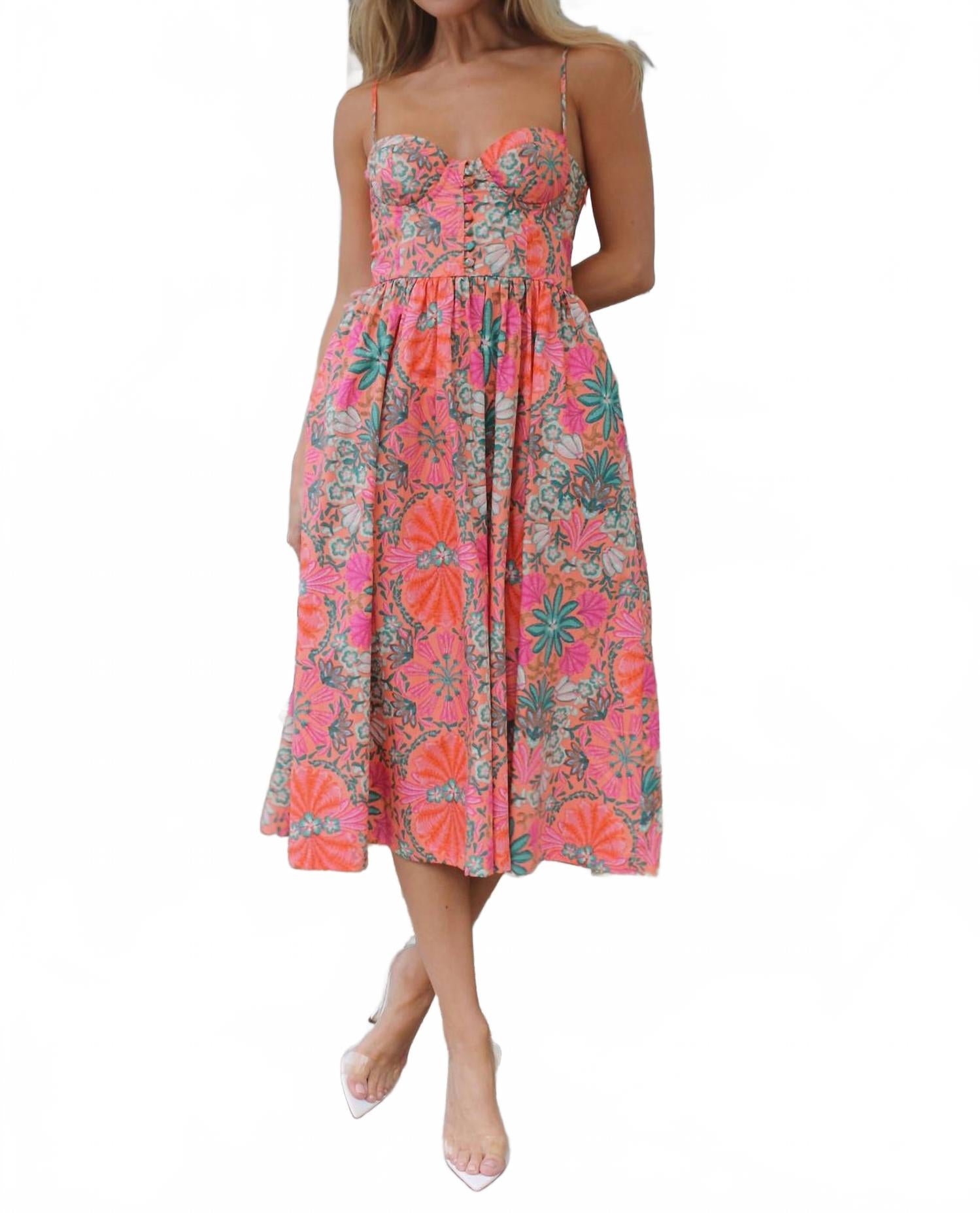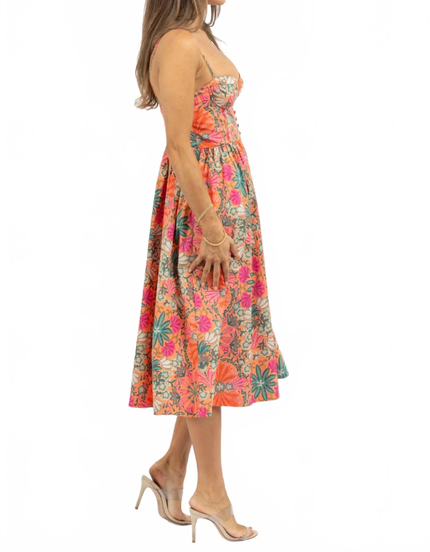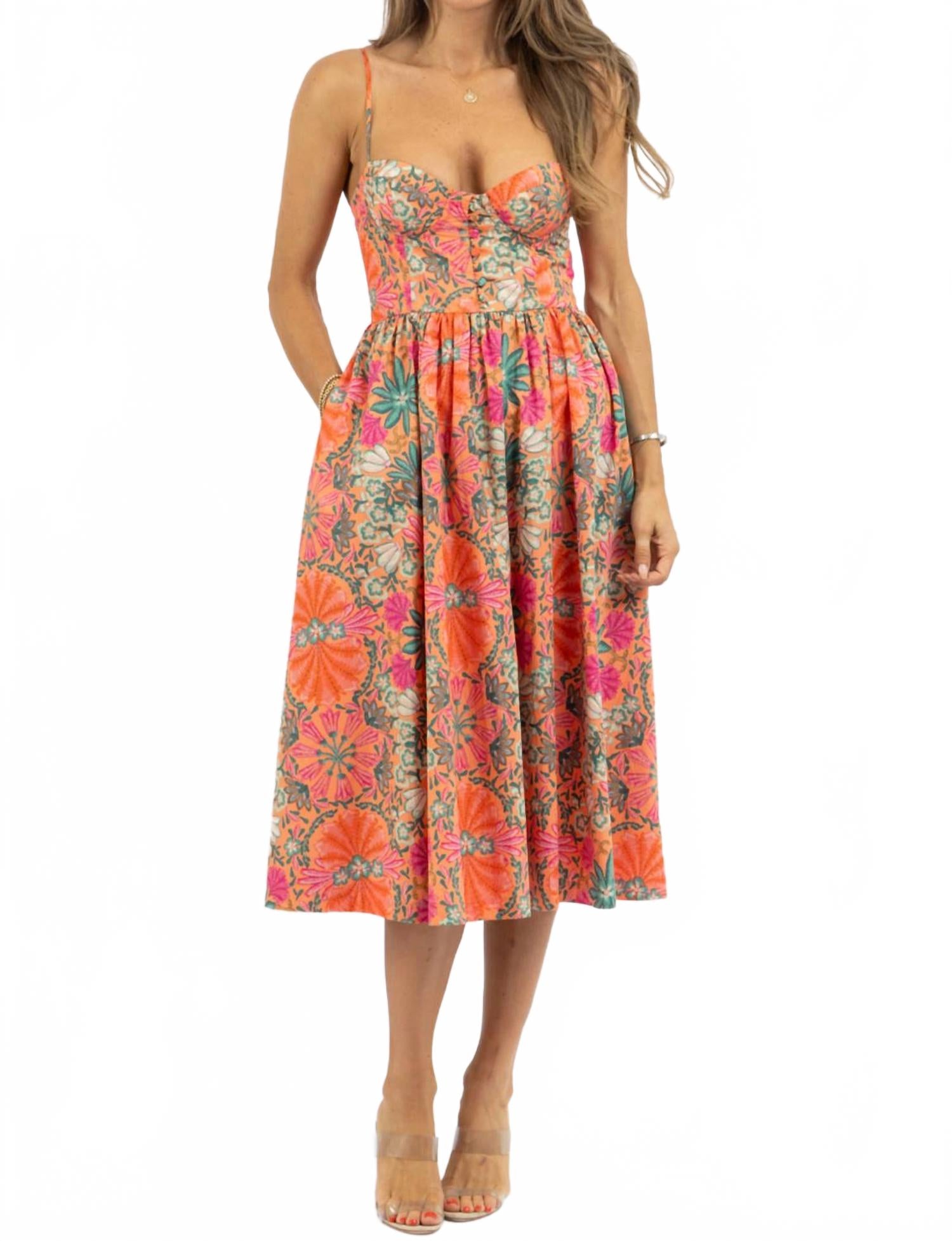 Повседневное, удобное и милое! Платье, которое вы будете носить круглый год. Представляем платье миди с цветочным принтом от OLIVACEOUS в ярком оранжевом цвете, идеально подходящее для любого летнего случая. Это платье без рукавов выполнено из комфортной хлопковой ткани смесовой расцветки, облегающего силуэта с шикарным бюстье и застежкой на пуговицы спереди. Платье изготовлено из 60% хлопка и 40% полиэстера, имеет вырез сердечком и удобные карманы. Застежка: пуговицы. Уход: машинная стирка и сушка в стиральной машине. Модель Наоми носит размер S, рост 178 см.