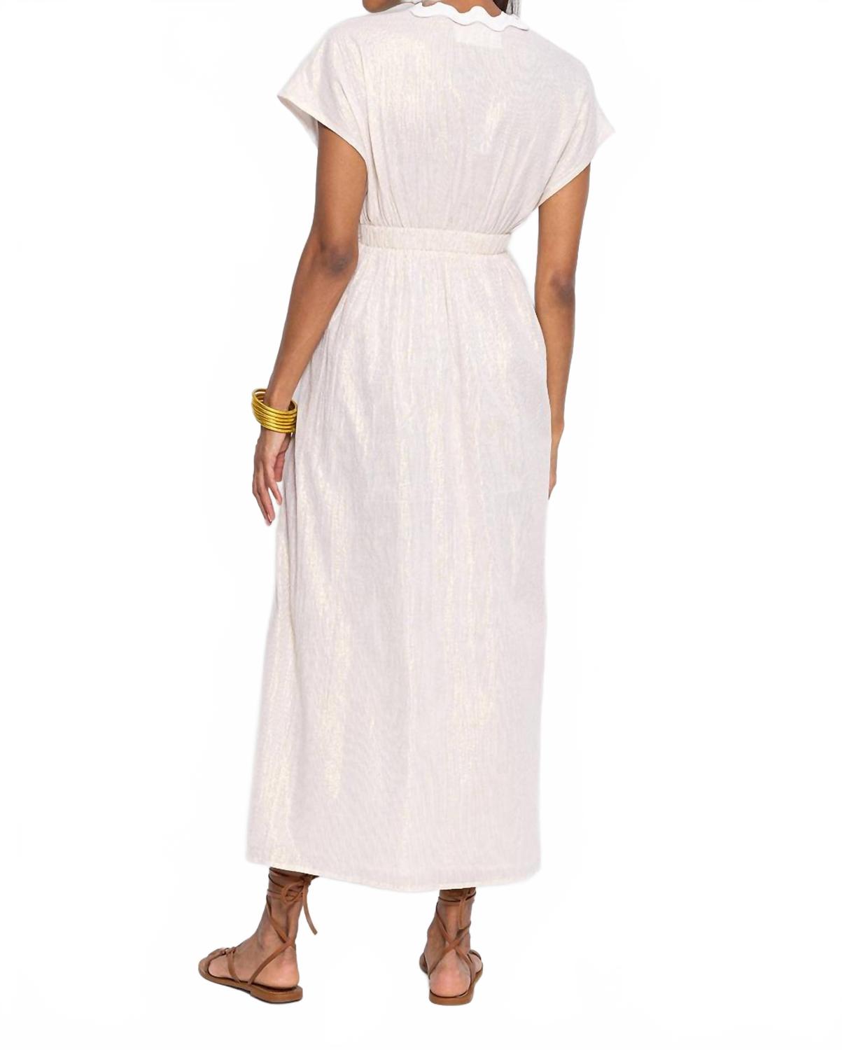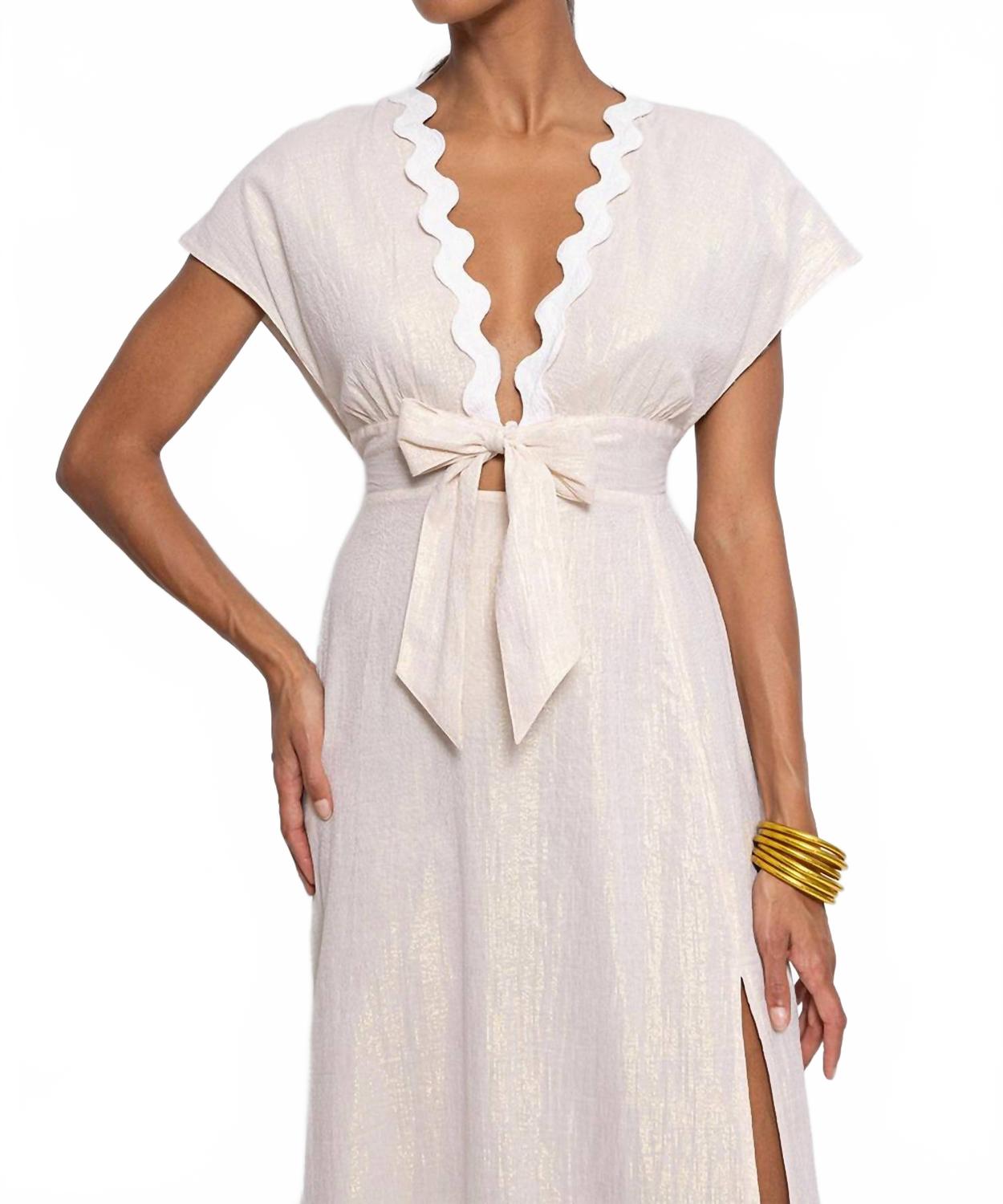 Ощутите элегантную изысканность в длинном платье Nora от Sundress - потрясающем белом платье, воплощающем суть тихой роскоши. Это платье миди с короткими рукавами и глубоким V-образным вырезом, а блестящие нити подчеркивают текстуру хлопковой ткани. Платье разработано во Франции и имеет боковой разрез, завязывается на завязке с декоративным поясом-узлом. Рекомендуется химчистка. Создайте яркий образ в этом платье, воплощающем идеальный баланс женственности и роскоши. 90% хлопок, 10% металлизированные нити.