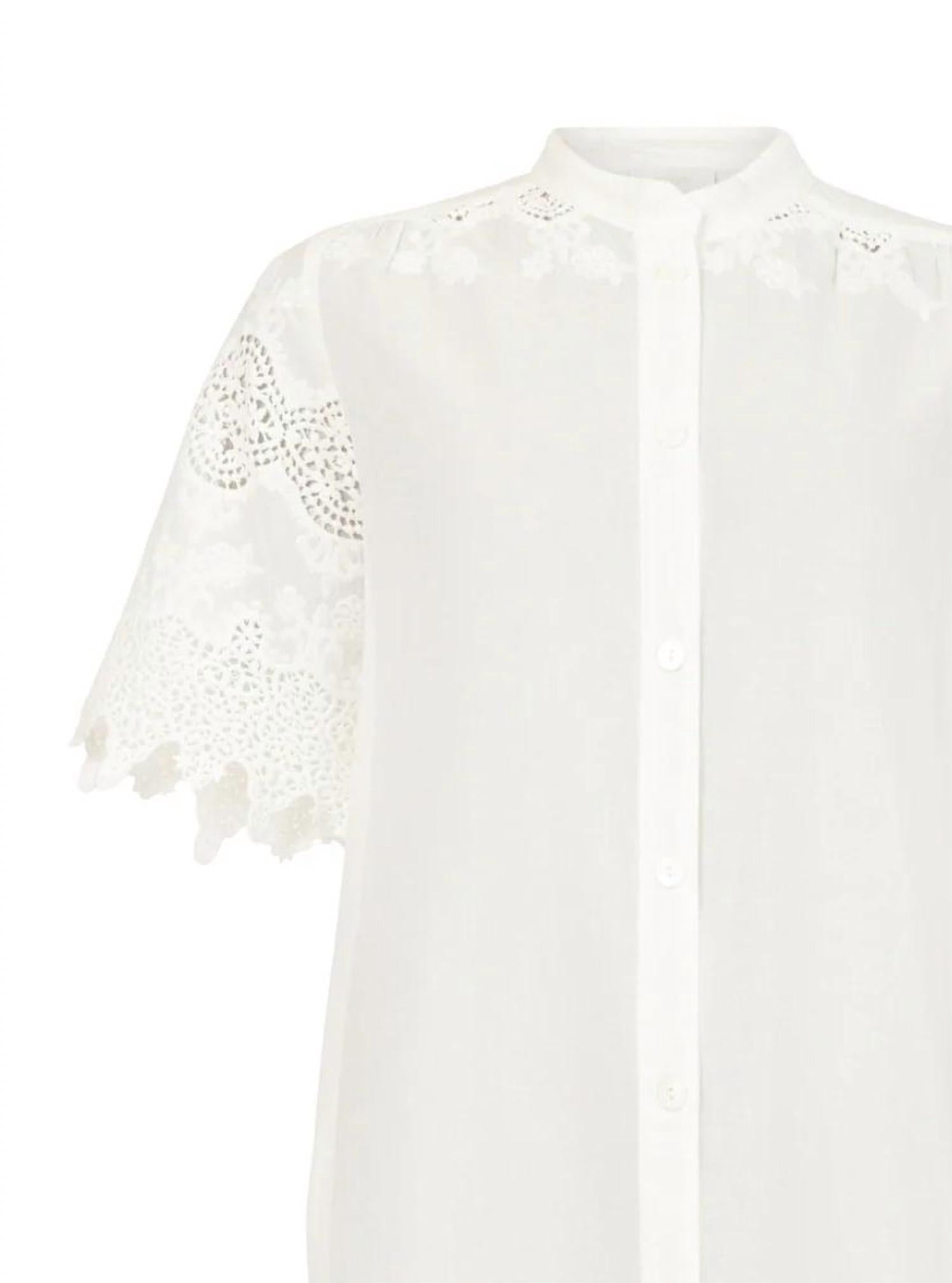 Короткое и воздушное платье для теплых дней. Оцените непринужденный стиль женского кружевного платья-рубашки от NOEN, идеально подходящего для весеннего и летнего гардероба. Это белоснежное мини-платье с короткими рукавами украшено изящной кружевной отделкой и вышивкой с люверсами, что придает ему женственности. Платье свободного прямого силуэта с застежкой на пуговицы спереди и воротником-стойкой выполнено из легкой дышащей ткани, идеально подходящей для мероприятий в стиле бохо-шик и отпуска. Для сохранения безупречного внешнего вида рекомендуется химчистка.