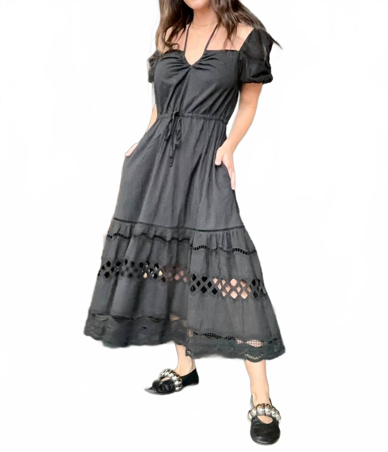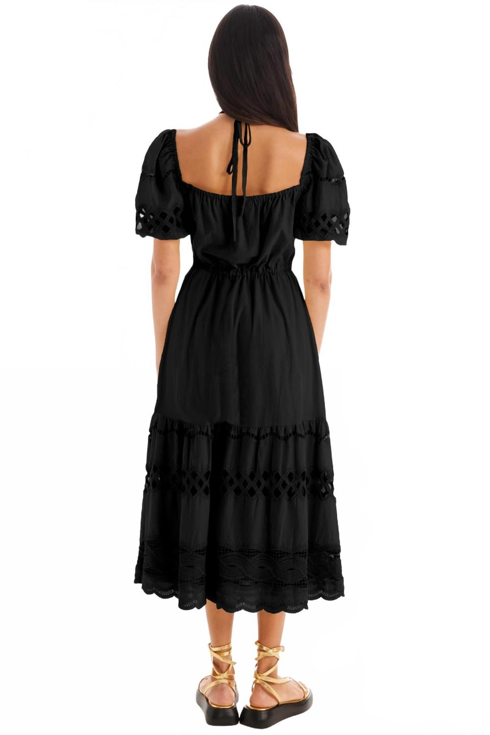Откройте для себя платье миди Emilia от ALLISON NEW YORK - минималистичное изделие, идеально подходящее для весеннего сезона. Это платье А-силуэта из мягкого и легкого 100% хлопка с вышитыми ажурными деталями, короткими рукавами и регулируемым V-образным вырезом. Длина платья - 122 см, обхват груди - 96 см, а талии - 86 см. Платье создано для стильного и комфортного ношения и требует только химчистки. Рост модели - 175 см, размер S - черный, что гармонично сочетается с элегантным минималистичным трендом.