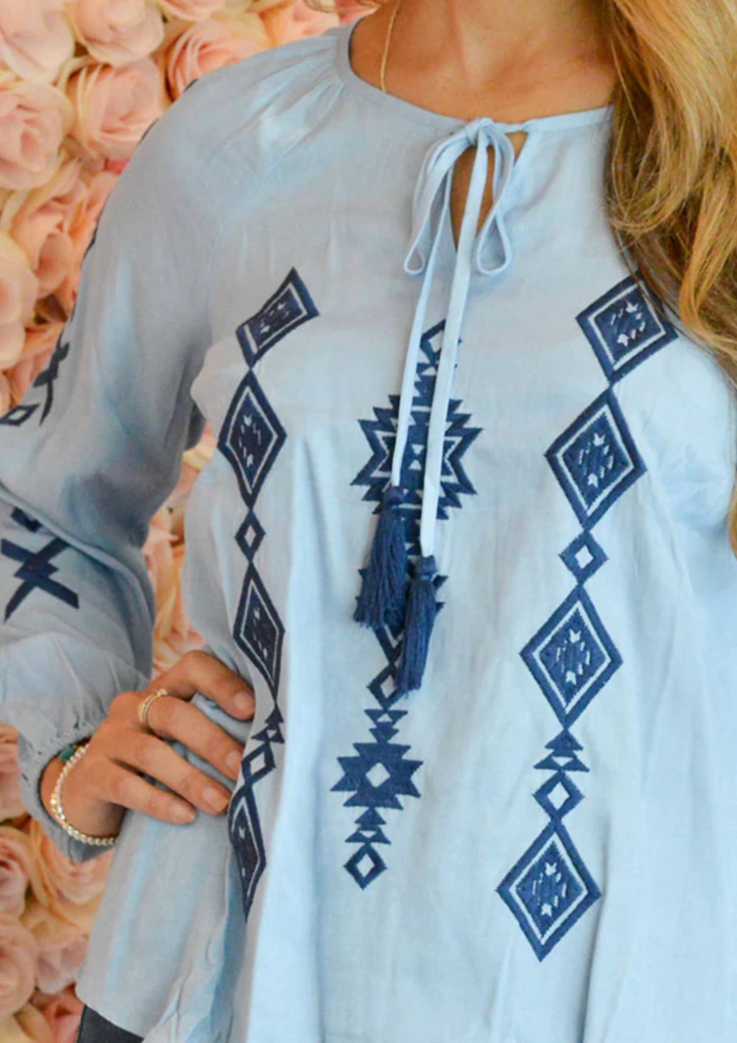 Откройте для себя топ с длинными рукавами Diamond от ANDREE BY UNIT - элегантное дополнение к вашему гардеробу благодаря очаровательному геометрическому узору. Эта блузка синего цвета, изготовленная из смеси 50% полиэстера и 50% вискозы, имеет стильные длинные рукава, эластичные манжеты и элегантный вырез-замочную скважину спереди. Размер идеально подходит для посадки: длина от плеча до подола 65 см, обхват груди от 84 см (маленький) до 91 см (большой). Застежка - надевать. Уход - машинная стирка.