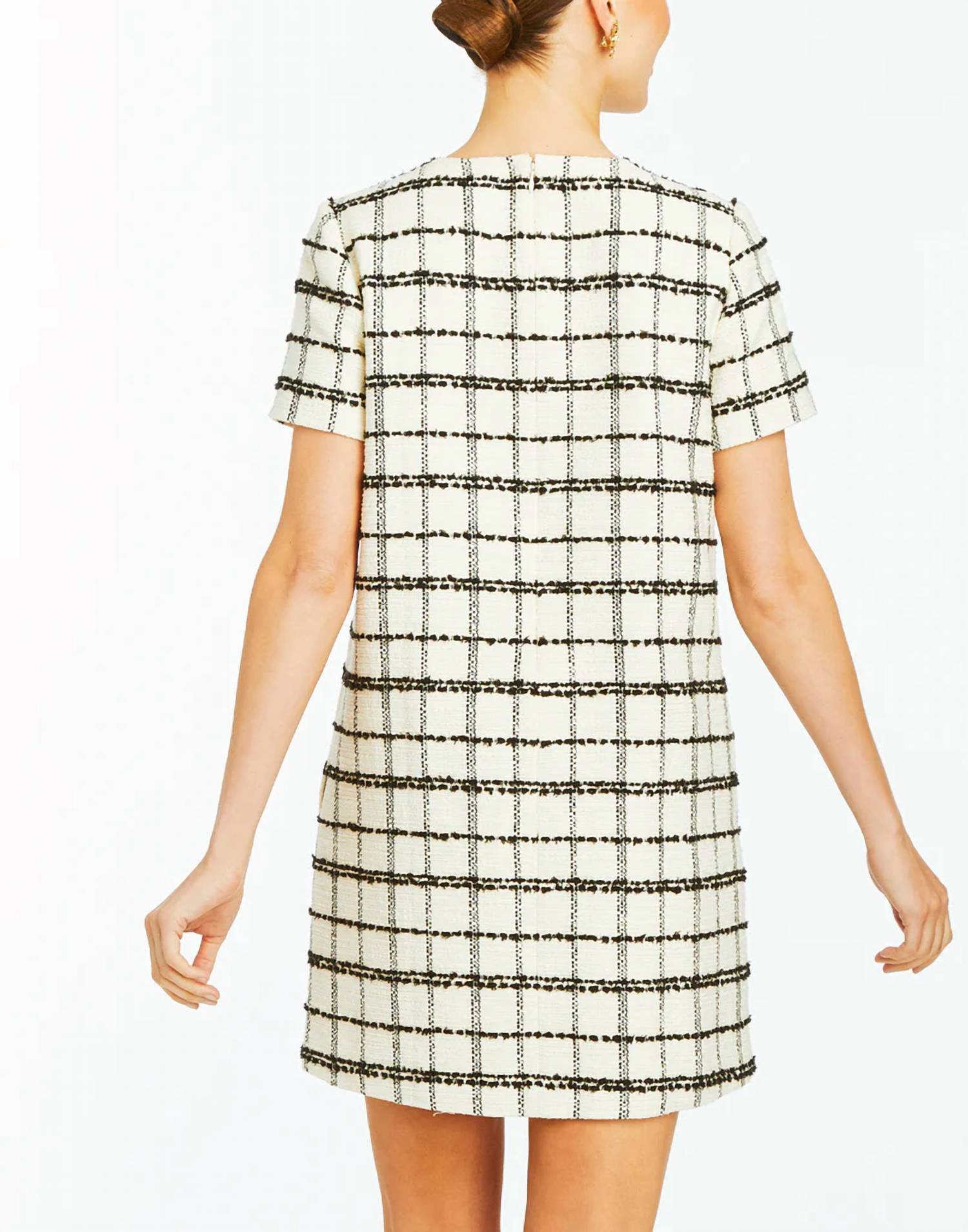 Короткое и воздушное платье для теплых дней. Платье-рубашка мини-длины с короткими облегающими рукавами. Закрытый круглый вырез горловины. Отрезной шов на левой стороне, открывающийся на подоле для создания небольшого разреза. Черные пуговицы из искусственной смолы в виде роз, расположенные вдоль отреза. Припуск на подгибку 2 дюйма. Твид: 76% хлопок, 20% полиэстер, 4% нейлон. Инструкции по стирке: не стирать, не отбеливать, не сушить в стиральной машине, только сухая чистка, гладить при низкой температуре. Рост модели: 5 футов 10 ½ | Длина платья: 34 дюйма.