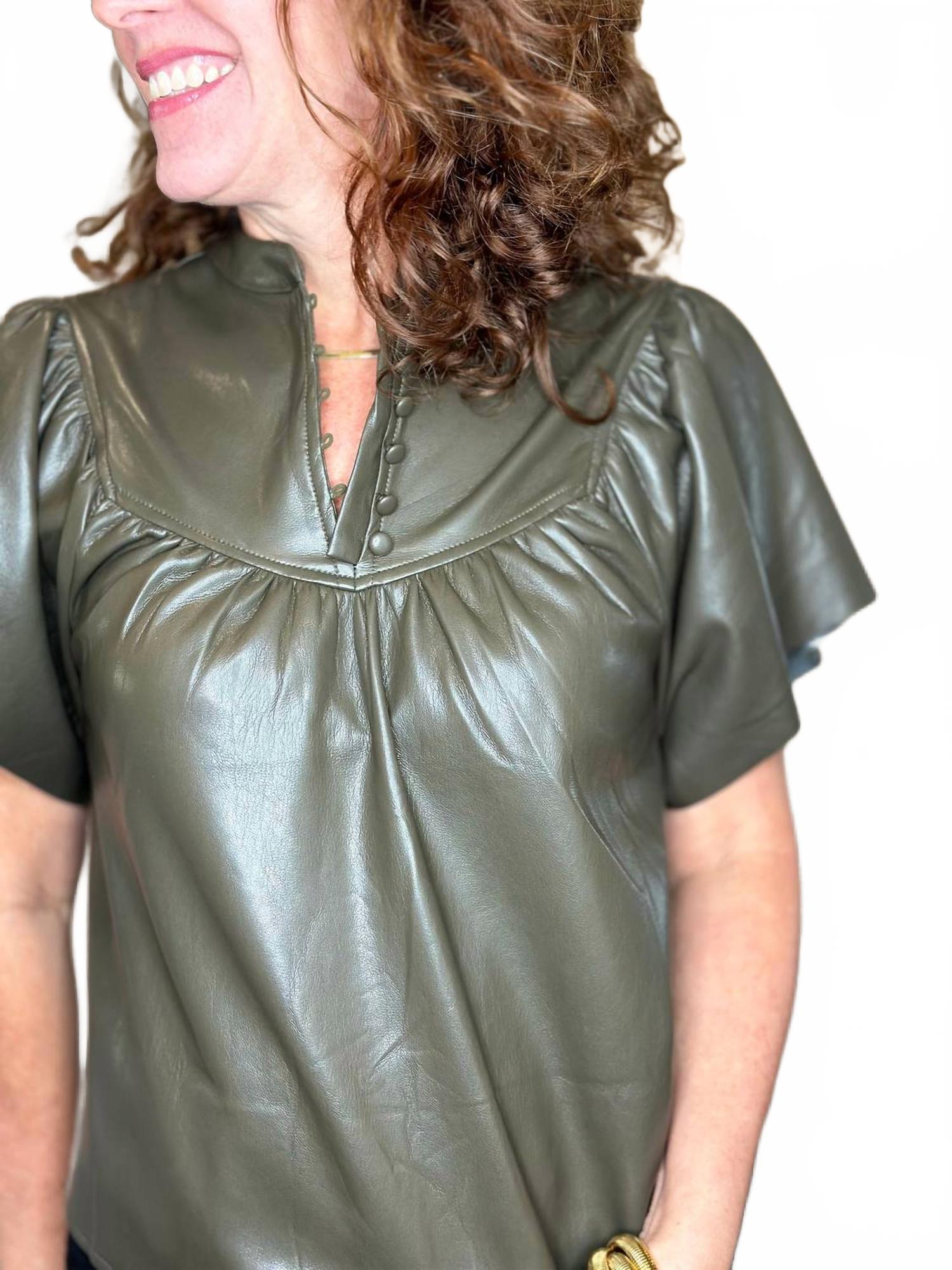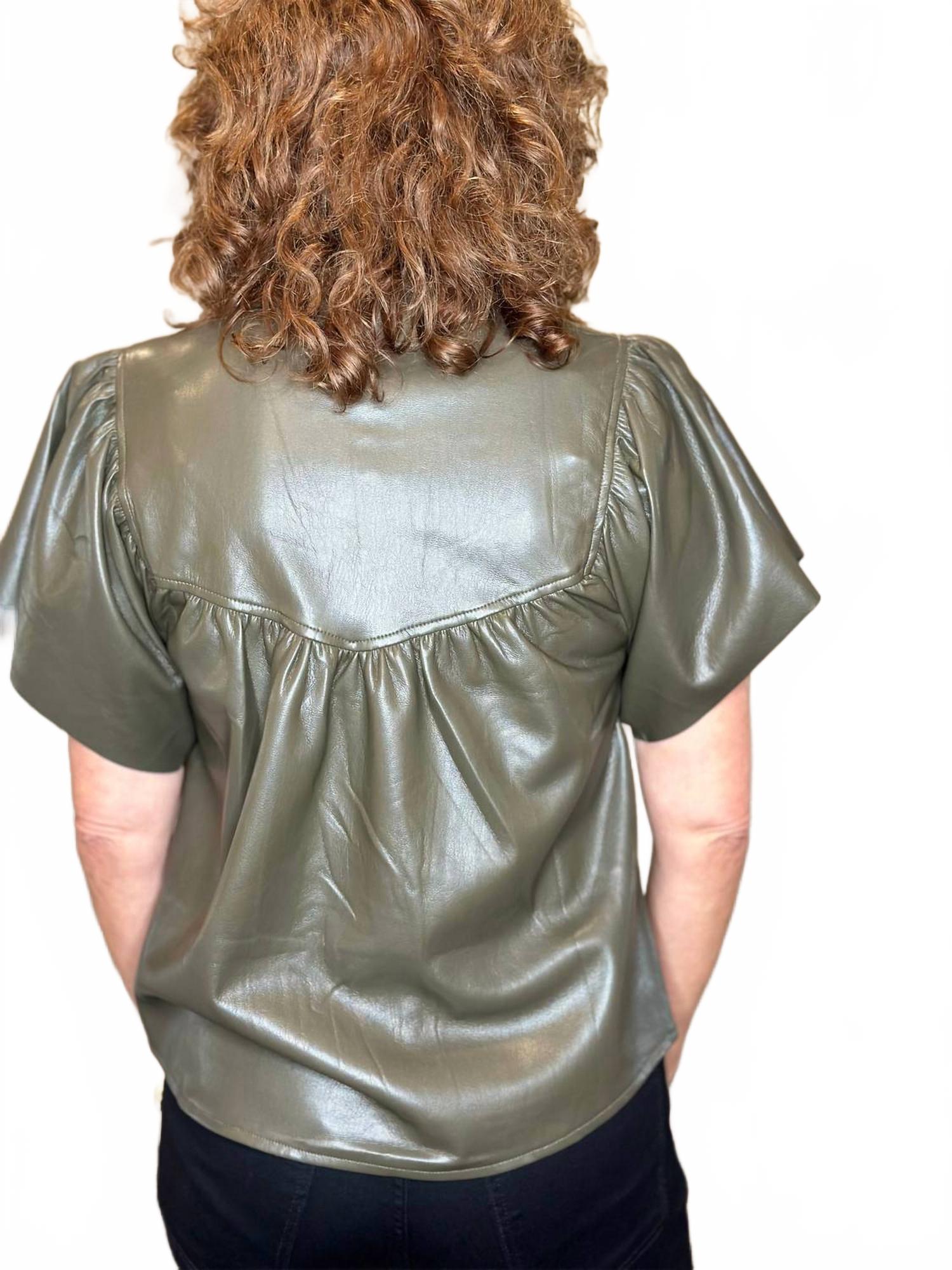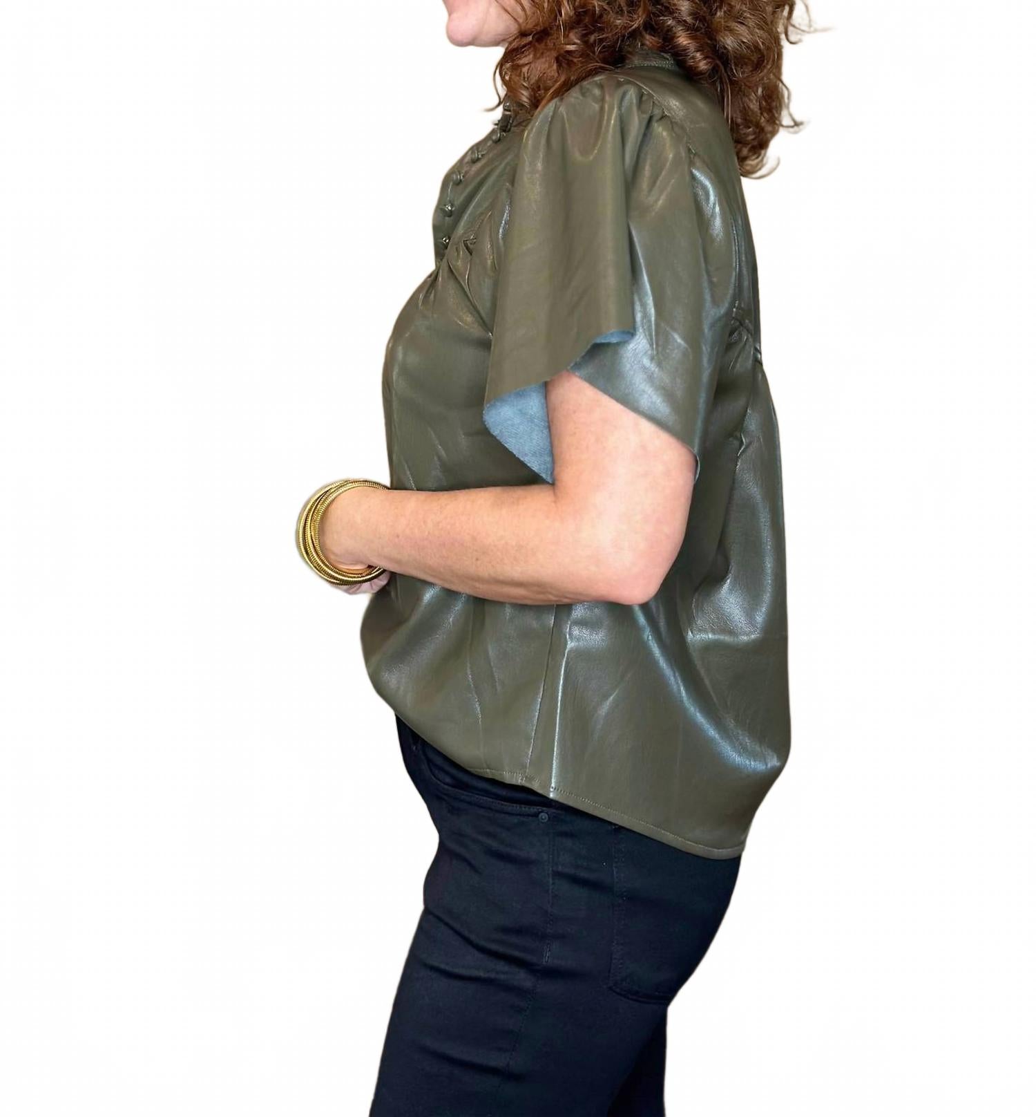 Универсальная блузка, которая подойдет как для работы, так и для ужина! Украсьте свой гардероб топом Lanni от MELISSA NEPTON - шикарной блузкой темно-хаки, созданной для женщин, предпочитающих минимализм. Эта блузка с короткими рукавами выполнена из мягкой, как масло, 100% полиуретановой веганской кожи. Она имеет V-образный вырез и застежку-липучку. Идеально подходит для летнего отпуска или Дня благодарения, обеспечивая непринужденный стиль и комфорт. Инструкции по уходу: ручная стирка и сушка в разложенном виде. Кэтлин, рост которой 160 см, носит размер S.