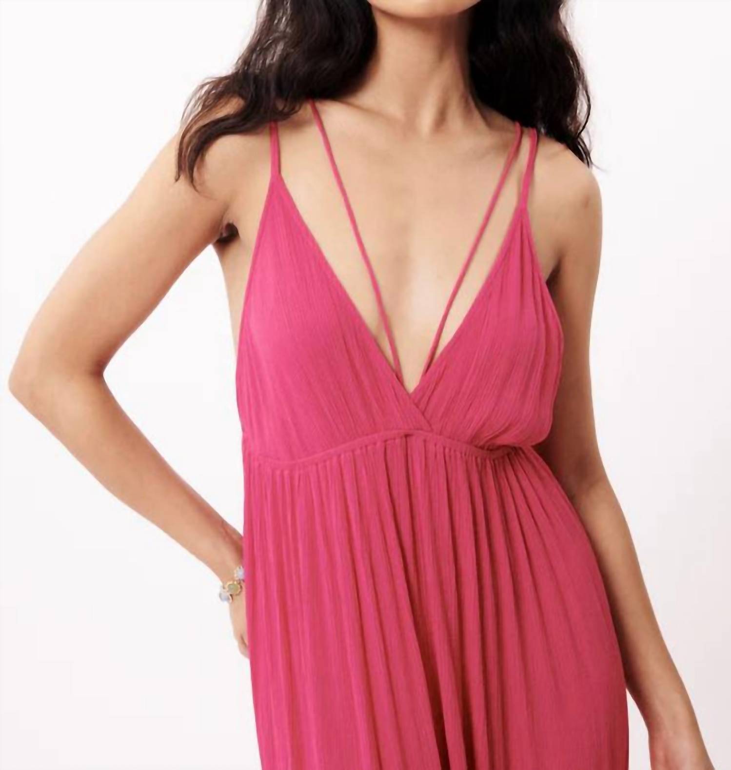 Ощутите элегантность в платье Ana Maxi Dress от FRNCH - великолепном платье без рукавов насыщенного цвета фуксии, идеально подходящем для летних мероприятий. Это длинное струящееся платье с V-образным вырезом и регулируемыми бретелями, стянутыми на талии для создания более выразительного силуэта. Платье выполнено из роскошной 100% вискозы и отличается элегантным А-образным силуэтом с застежкой-липучкой для удобства ношения. Дополните его кроссовками или украсьте образ каблуками для особых случаев.