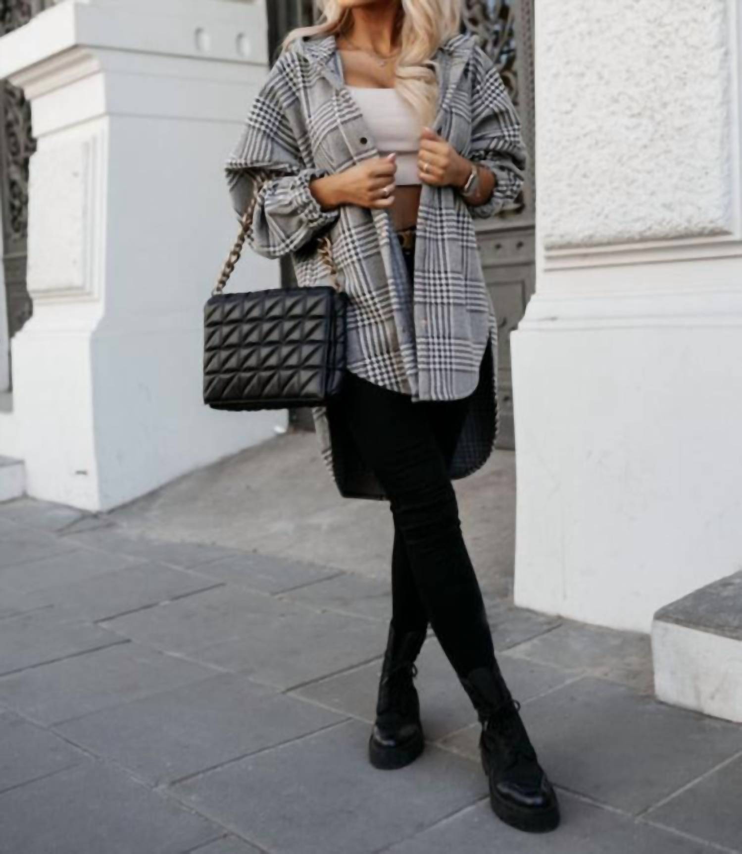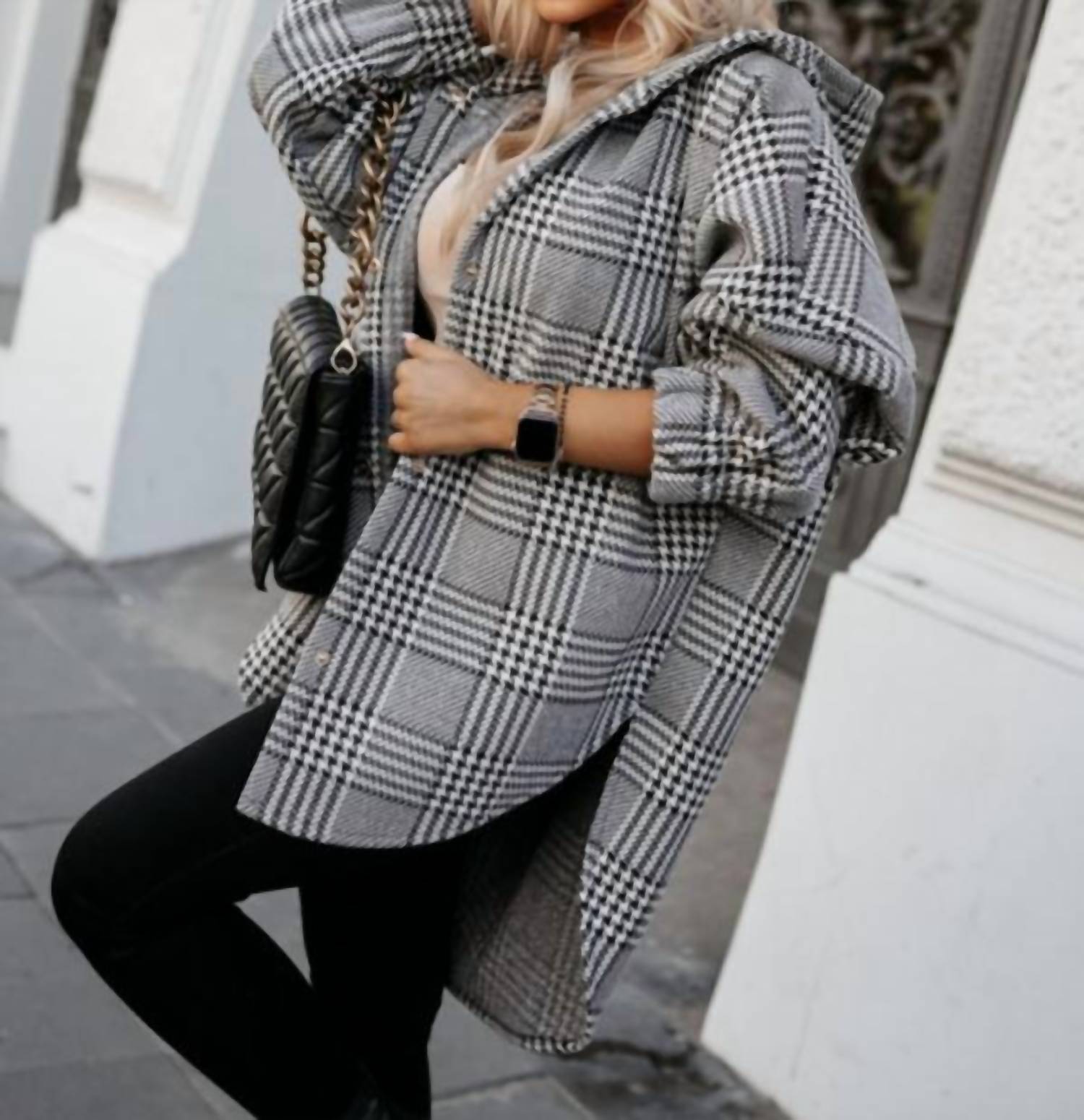 Милая, непринужденная и удобная. Эта куртка - просто маст-хэв. Окутайте себя стильным теплом с курткой All The Tooth от Little Daisy Closet - незаменимой вещью для осени. Эта куртка свободного кроя с длинными рукавами, манжетами на пуговицах и капюшоном на горловине украшена клетчатым узором «гусиная лапка» в серо-голубом цвете. Изготовленная из 100% полиэстера, неэластичная ткань имеет удлиненный силуэт до середины бедра, идеально подходящий для ношения поверх футболок. Застежка на пуговицы спереди и спущенные плечи придают ей уютный и непринужденный вид.