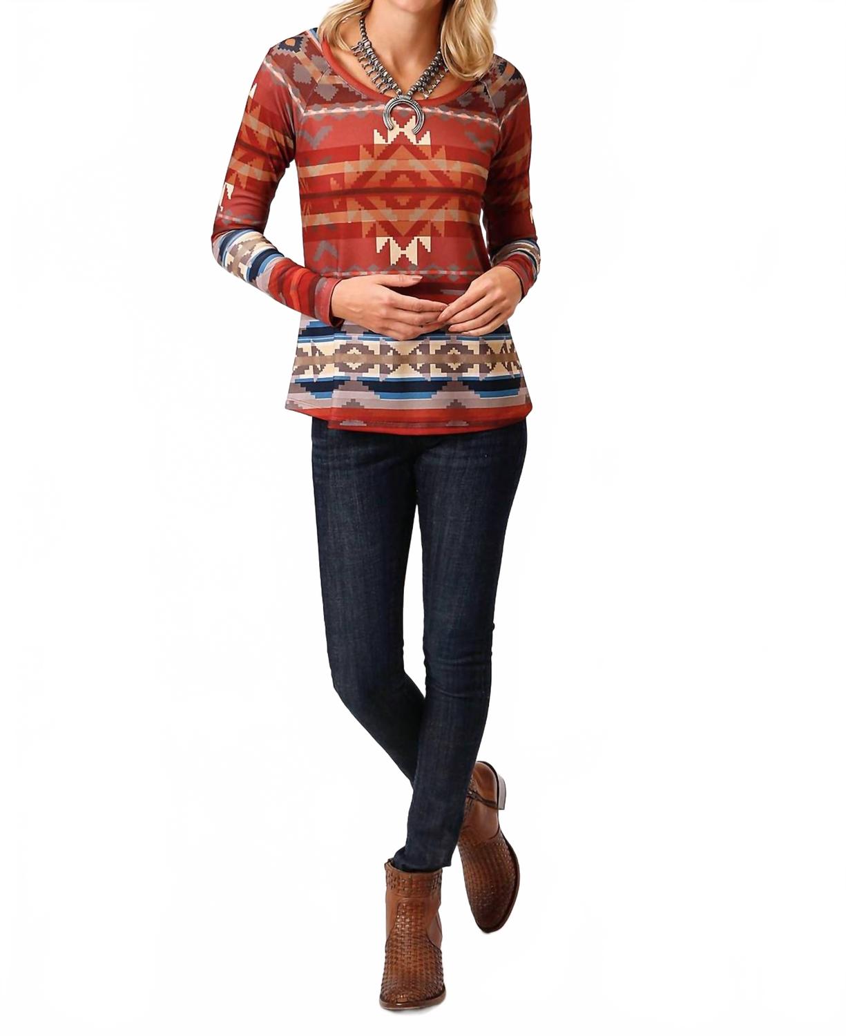 Ощутите идеальное сочетание комфорта и стиля в этом модном свитере с круглым вырезом, который легко добавит изюминку вашему гардеробу. Сочетайте его с любимыми джинсами и лоферами для создания идеального образа. Откройте для себя свитер Aztec Pullover от Roper, эффектную вещь из коллекции Studio West. Этот женский топ с длинными рукавами реглан и круглым вырезом украшен ацтекским узором ярко-красного цвета. Состав: 95% полиэстер, 5% спандекс. Застежка: надевайте. Уход: ручная стирка. Идеально подходит для неформальных прогулок или музыкальных фестивалей.