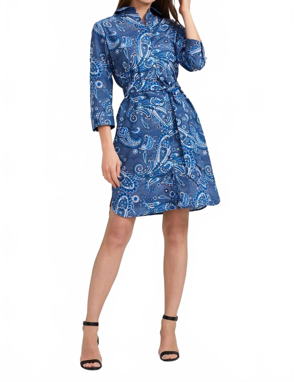 Женское джинсовое платье Rocca от Foxcroft - незаменимая вещь в любом летнем гардеробе. Это платье-рубашка с эффектным принтом пейсли в синем цвете, вдохновленном денимом, дополнено рукавами три четверти и заостренным воротником, создающими изысканный образ. Застежка на пуговицы и дополнительный пояс с завязками позволяют создавать разнообразные образы, а свободный подол и карманы добавляют практичности и элегантности. Длина платья по центру спинки 39 дюймов (91 см) в размере S делает его идеальным для отпуска и соответствует максималистскому тренду.