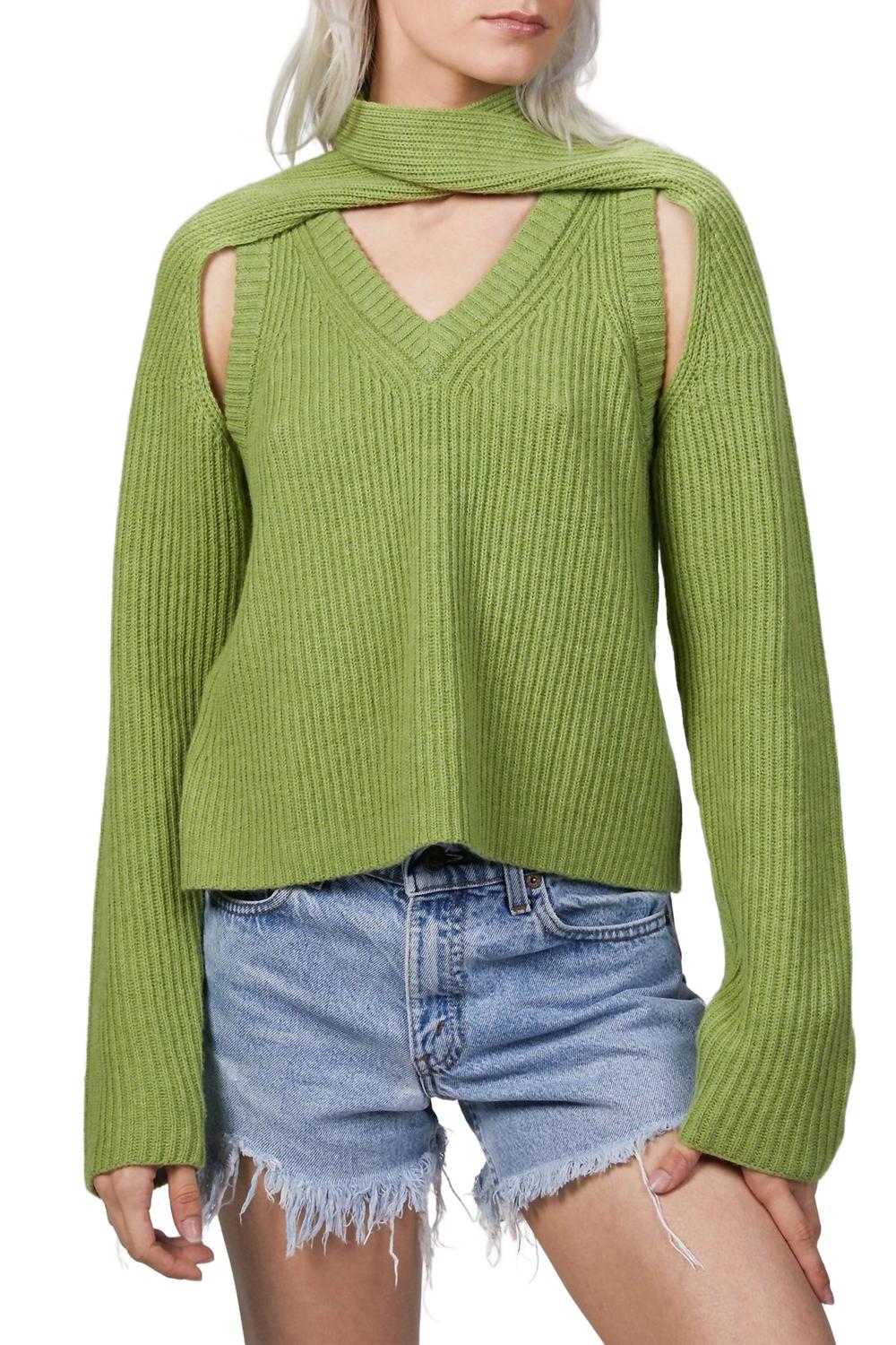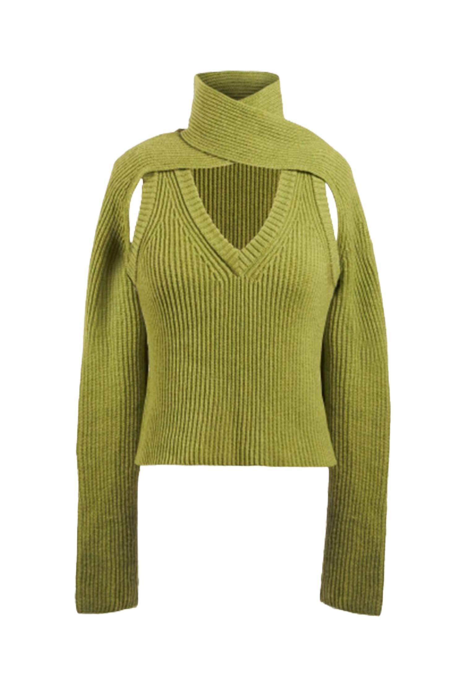 Весенне-летняя коллекция Wynn Hamlyn 2021 года полна уникальных трикотажных изделий, как, например, этот свитер ребристого плетения. Связанный в Новой Зеландии из шерсти, он имеет петлю, которую можно обернуть вокруг шеи или оставить свободной спереди или сзади, создавая вырез на плечах. Носите его с юбкой миди и едва заметными сандалиями.