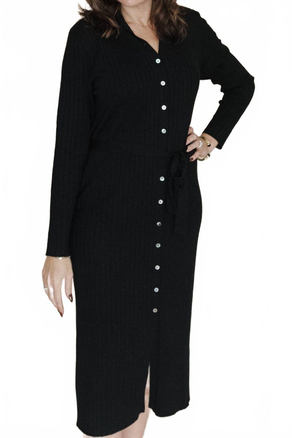 Просто добавьте шлепанцы или мюли, и все готово. Платье Better Late Than Never Button Down от In February - стильное черное платье миди, универсальное и удобное. Благодаря длинным рукавам и ребристой текстуре это платье легко превращается из уютного платья-свитера на пуговицах в кардиган миди с открытым передом. Изготовленное из смесовой вискозы, оно имеет практичную застежку на пуговицы и элегантный воротник, идеально подходящий для работы или путешествий. Инструкции по уходу: ручная стирка и сушка в разложенном виде на горизонтальной поверхности.