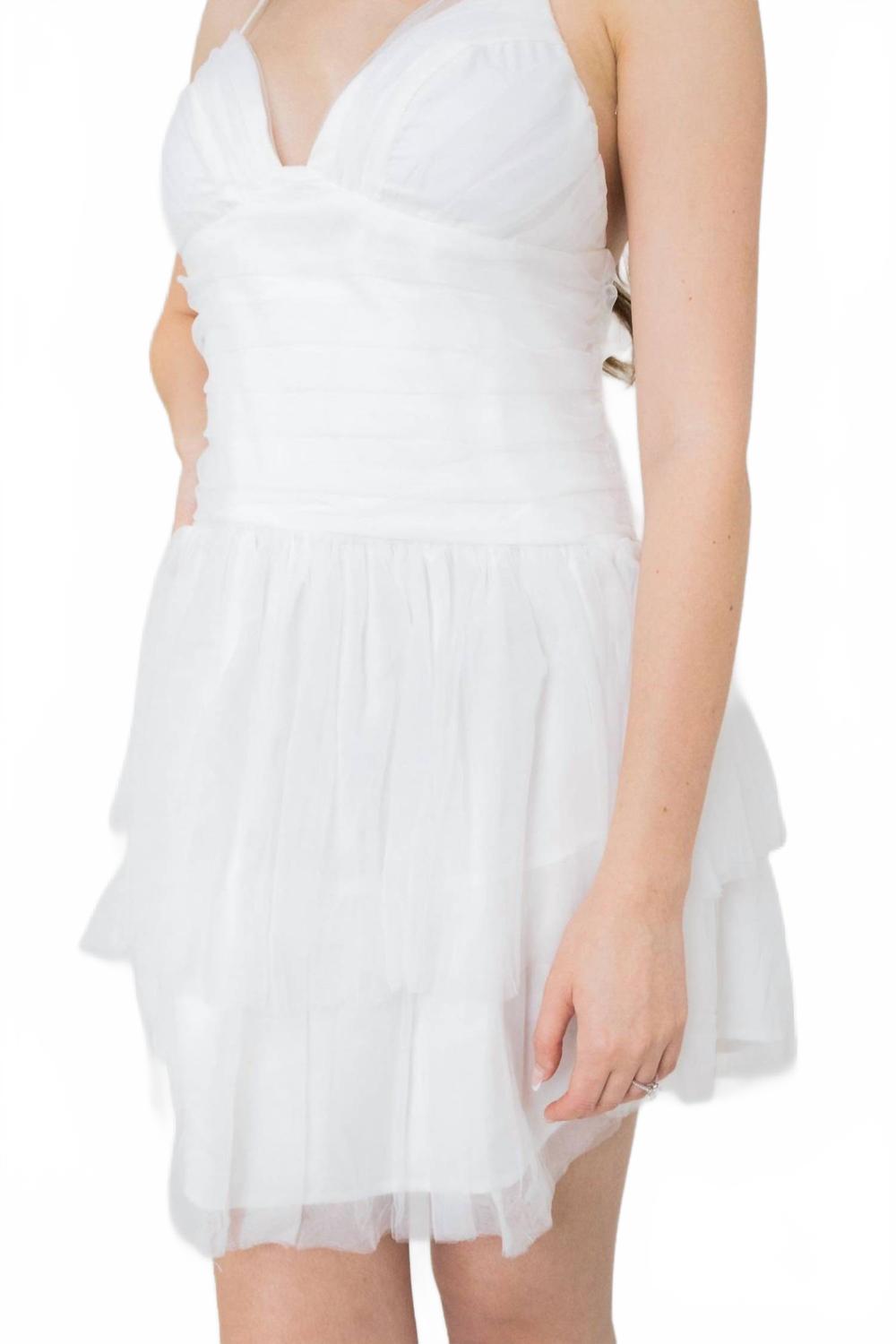 Представляем мини-платье Katniss от One and Only Collective - шикарное дополнение к вашему вечернему гардеробу. Это белое мини-платье с тонкими бретельками, многослойным подолом и вырезом в форме сердечка создает элегантный силуэт благодаря А-силуэту. Платье изготовлено из 100% полиэстера, дополнено сборками и завязкой на бретельках сзади с удобной застежкой-молнией. Для бережного ухода рекомендуется ручная стирка в холодной воде, избегать замачивания, отжима и отбеливания, чтобы сохранить стиль 90-х.