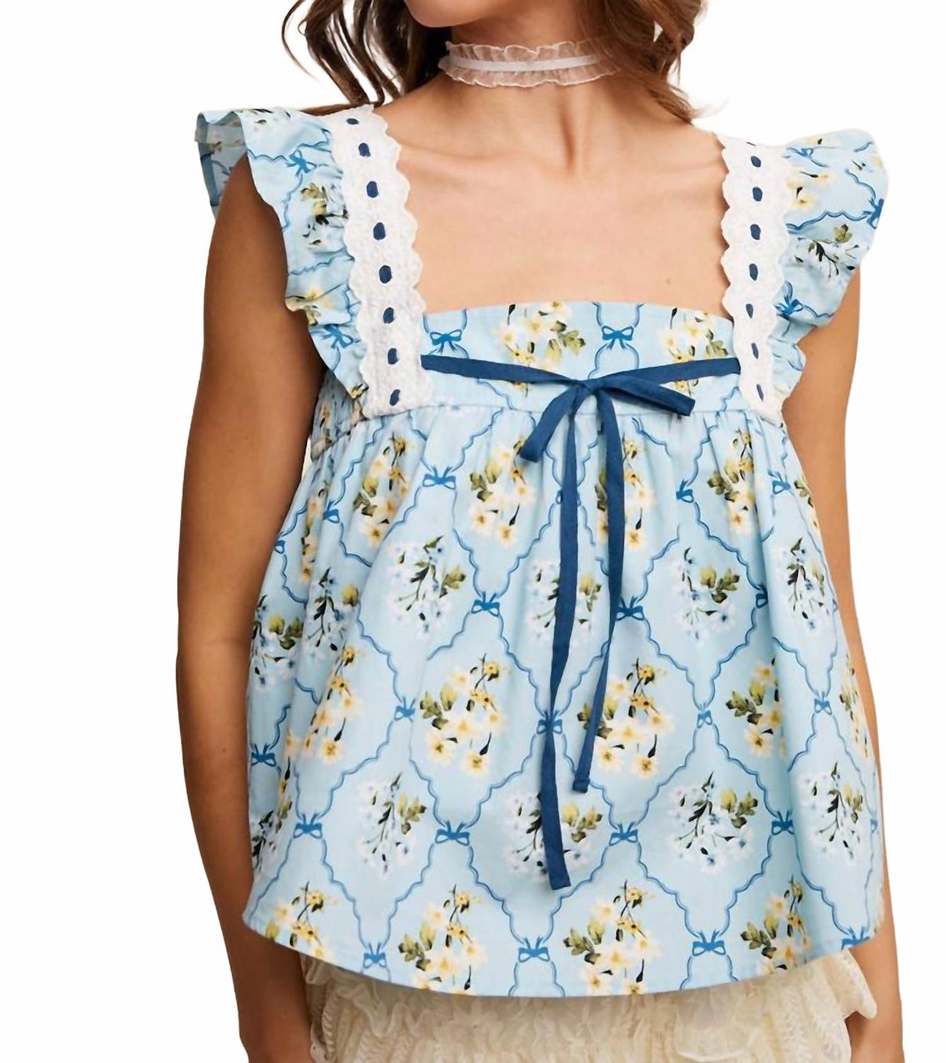 Идеальная майка для теплого времени года. Представляем топ Mae Floral Flutter Sleeve от Listicle - восхитительное дополнение к любому гардеробу благодаря безрукавному крою и квадратному вырезу. Этот очаровательный синий топ из 100% хлопка украшен причудливыми цветочными принтами и изысканными кружевными деталями, а также дополнен присборенной спинкой и очаровательным завязкой сзади. Эта модель идеально подходит женщинам, сочетая в себе стиль и комфорт. Рекомендации по уходу: бережная ручная стирка и сушка на веревке для сохранения нежной красоты.
