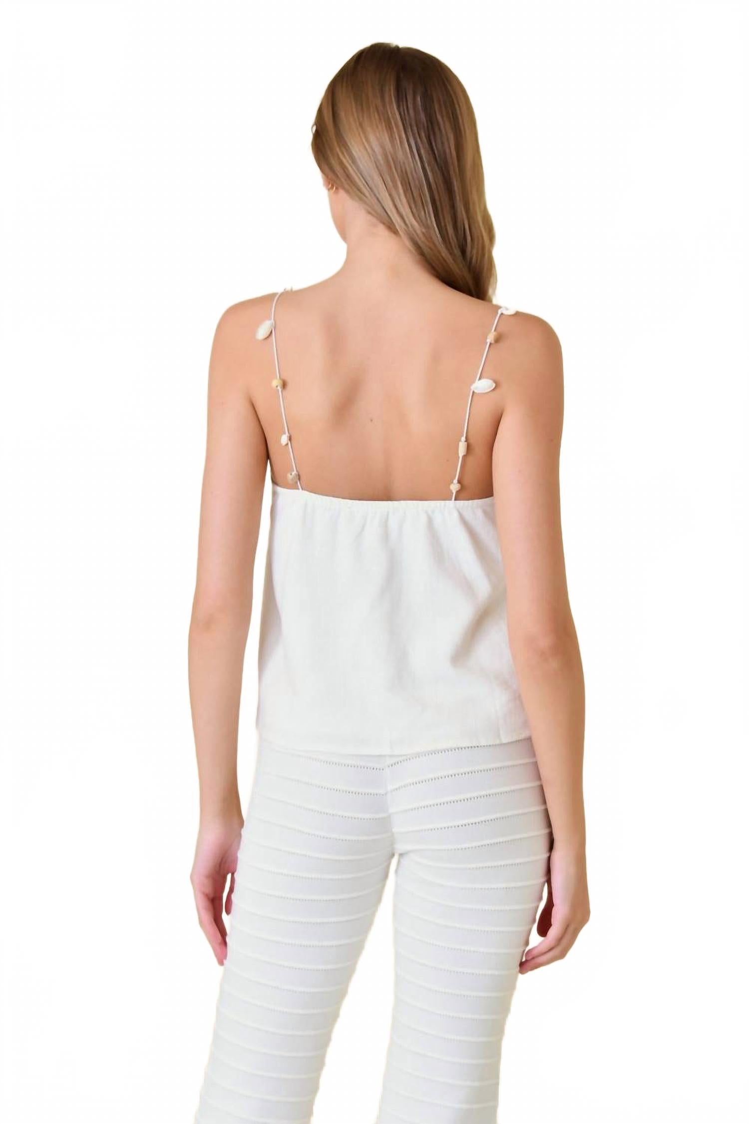 Идеальная майка для теплого времени года. Дополните свой летний гардероб топом Seashell Strap Top от Fore - стильной однотонной белой майкой, идеально подходящей для непринужденного пляжного образа. Этот топ на тонких бретельках, украшенных изящными ракушками, и со стильным квадратным вырезом имеет свободную полуукороченную длину, создавая модный и универсальный силуэт. Застежка: легко надевать, чтобы было удобно и комфортно. Идеально подходит для создания образа в стиле 90-х, идеально подходит для Дня благодарения или любого курортного отдыха.