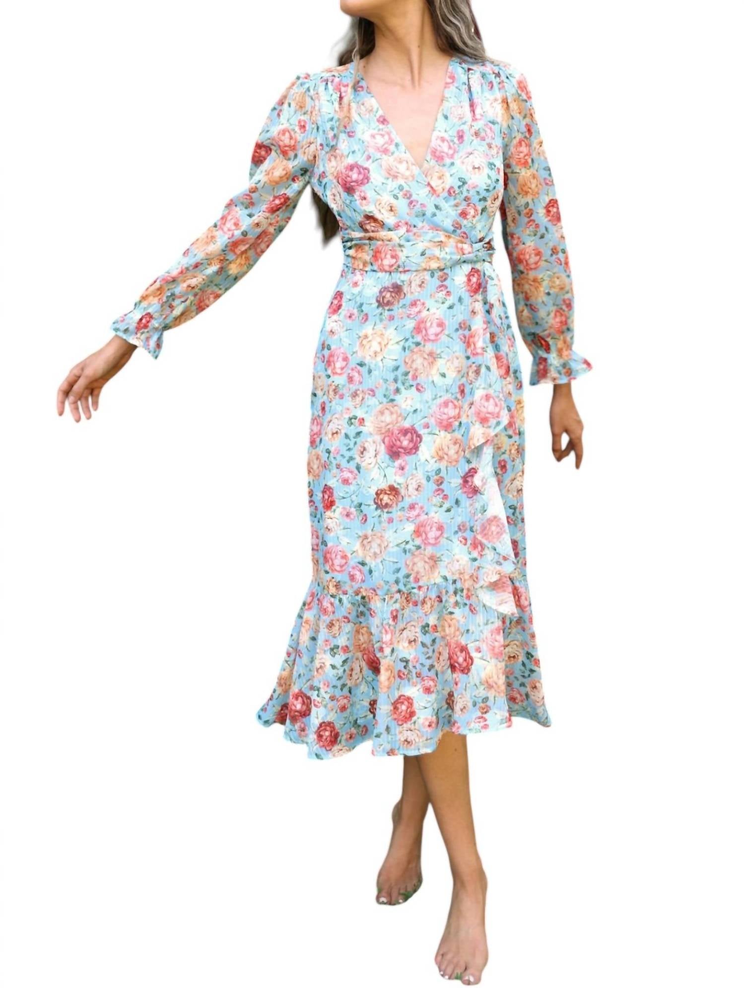 Платье идеальной длины существует. Окунитесь в непринужденную элегантность с платьем Penelope Faux Wrap Dress от Adelyn Rae, идеально подходящим для весенних мероприятий. Это платье миди с цветочным принтом нежно-голубого цвета с длинными рукавами-фонариками и манжетами с оборками, облегающим силуэтом-оберткой и утягивающей талией, украшенной искусственным поясом. Платье удобно застегивается на невидимую молнию сзади и полностью на подкладке для вашего комфорта. Идеально подходит для коктейльных вечеринок или шикарных встреч на свежем воздухе.