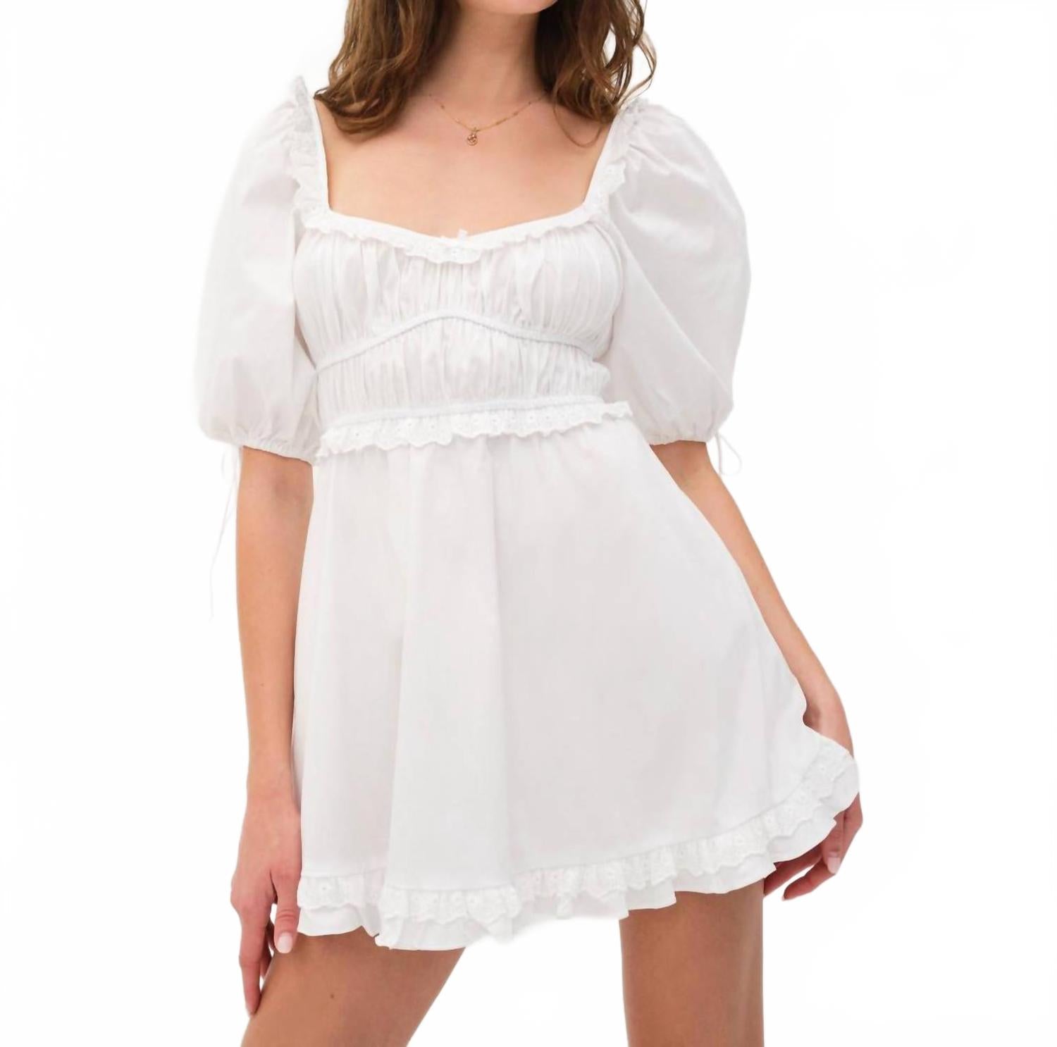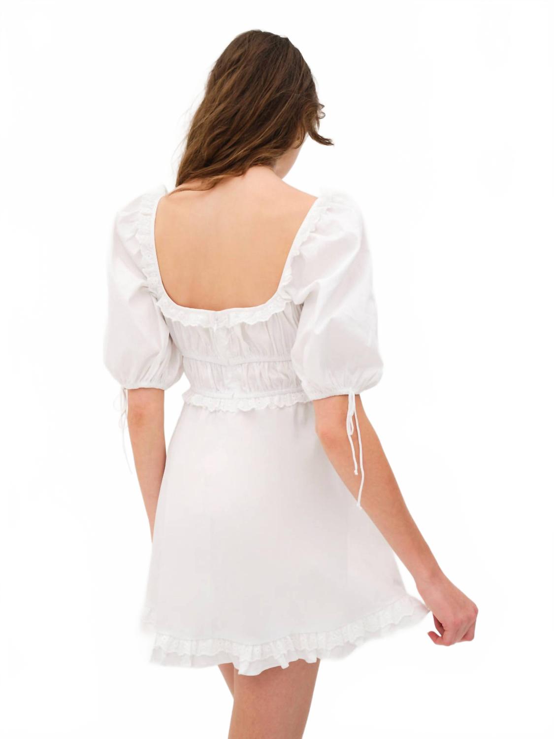 Свободное и элегантное платье, которое вы будете носить круглый год. Насладитесь элегантностью в мини-платье Jackson от For Love & Lemons, созданном в стиле утонченного минимализма в классическом цвете слоновой кости. Это платье облегающего кроя с расклешенной юбкой отличается очаровательными короткими рукавами-буфами и эластичным лифом, украшенным мини-рюшами и фестончатой ​​хлопковой отделкой с люверсами. Платье изготовлено из 100% хлопка и застегивается на молнию сзади для безупречного вида. Уход: рекомендуется химчистка в эко-лавках.
