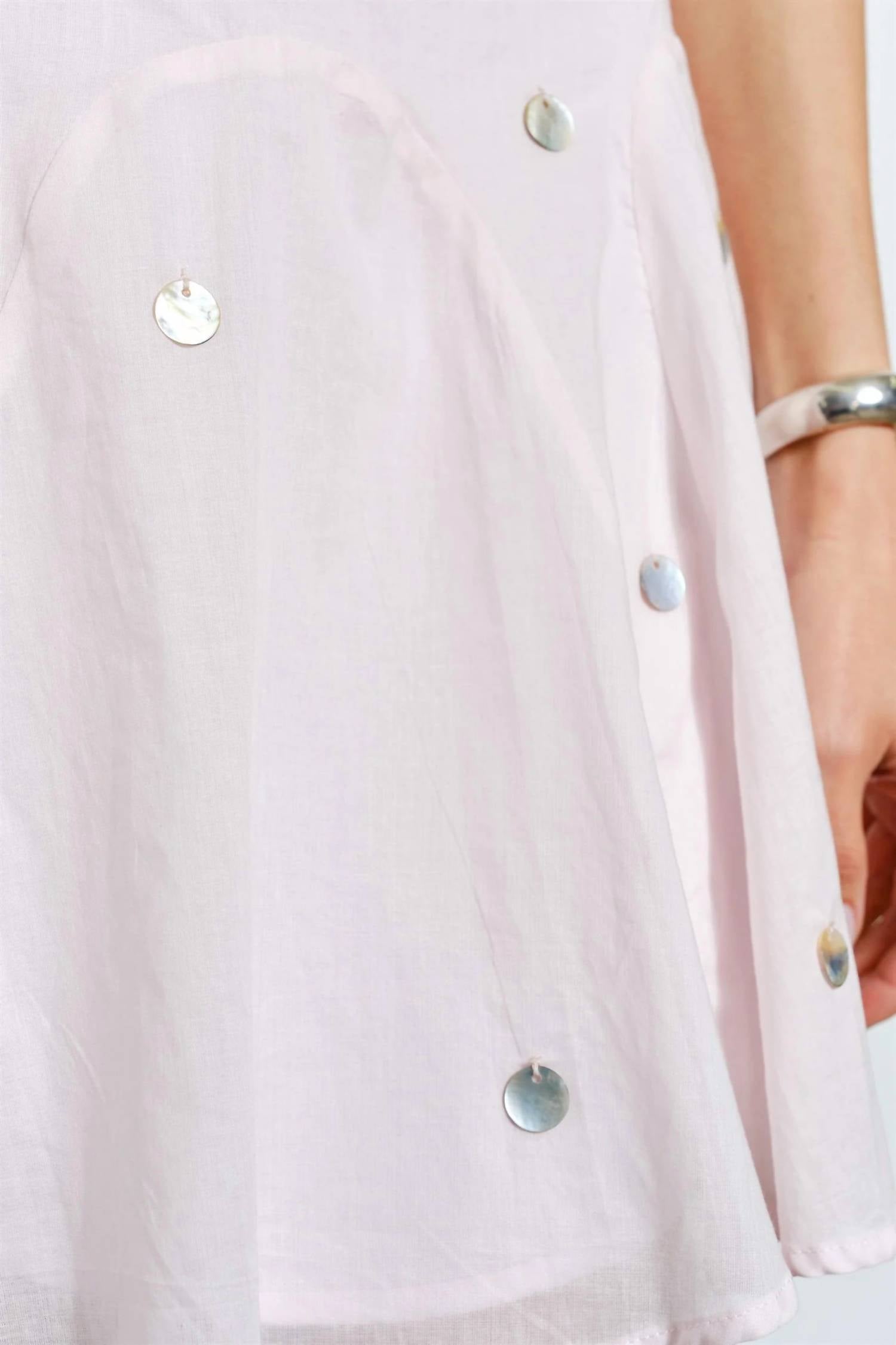 Идеальное мини-платье для теплых месяцев. Встречайте мини-платье Bella Vita от Loucia - кокетливый выбор для вашего летнего гардероба в очаровательном нежно-розовом цвете. Это платье на тонких бретельках с вырезом в форме сердечка, облегающим лифом и расклешенной юбкой-годе, украшенной нежной перламутровой отделкой. Платье выполнено из хлопка с очаровательным узором в горошек и идеально подходит для отпуска и празднования Дня святого Валентина. Застежка - завязка. На модели Клаудия размер M (рост 165 см, обхват груди 34B, размер джинсов 27).