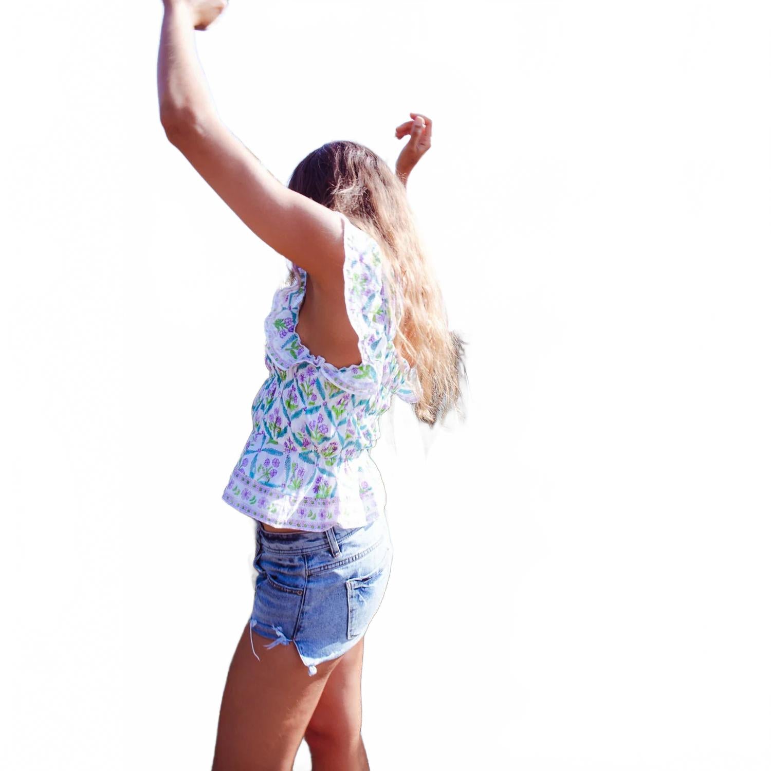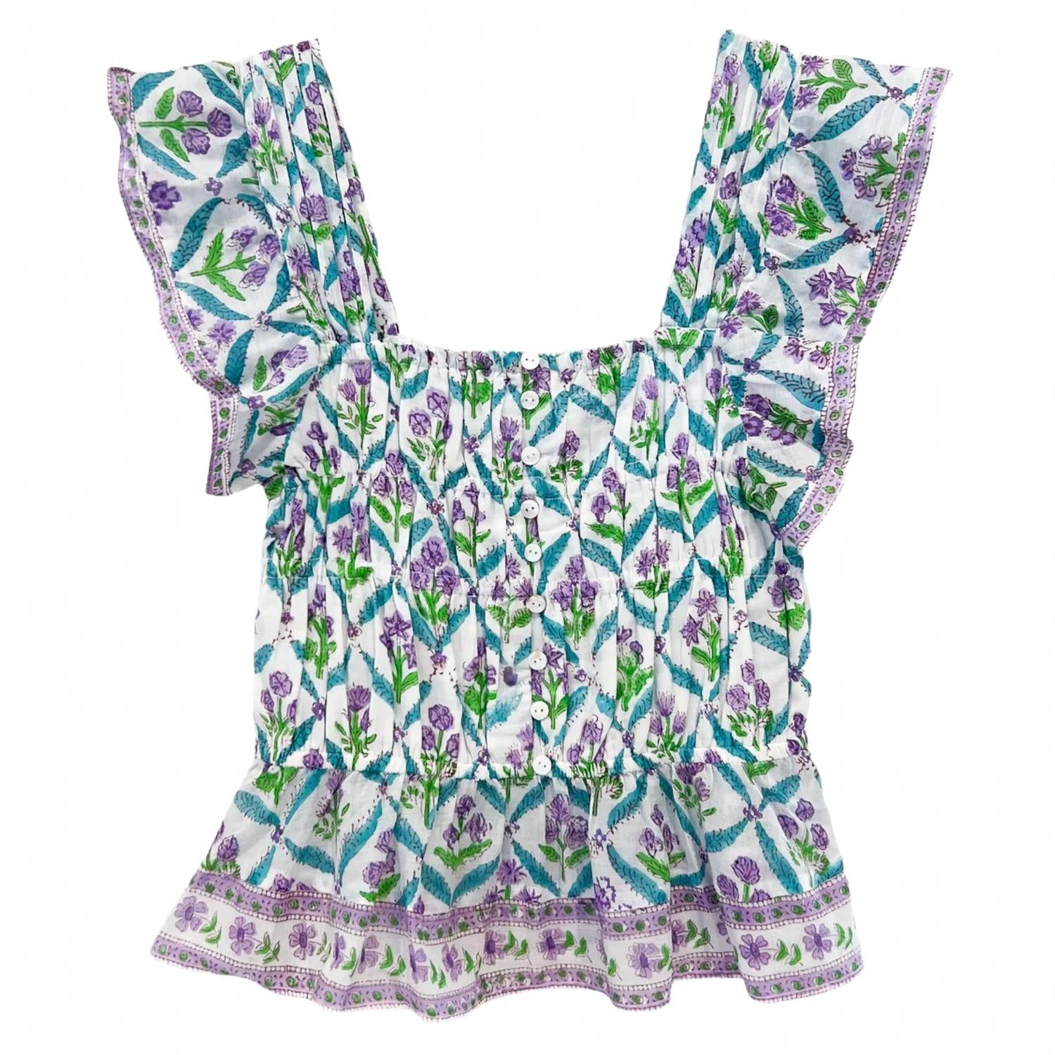 Продемонстрируйте немного своей красоты в этом милом и непринужденном укороченном топе. Представляем топ Fleur от BELL - очаровательную модель с бирюзово-фиолетовым ромбовидным узором, идеально подходящую для весны. Этот укороченный топ без рукавов с квадратным вырезом и бретелями-оборками выполнен из шелково-хлопковой вуали, что обеспечивает легкость и воздухопроницаемость. Застежка на пуговицы спереди придает винтажный шарм, а эластичный пояс обеспечивает удобную посадку. Рисунок - цветочный принт, выполненный вручную. Застежка - пуговицы.