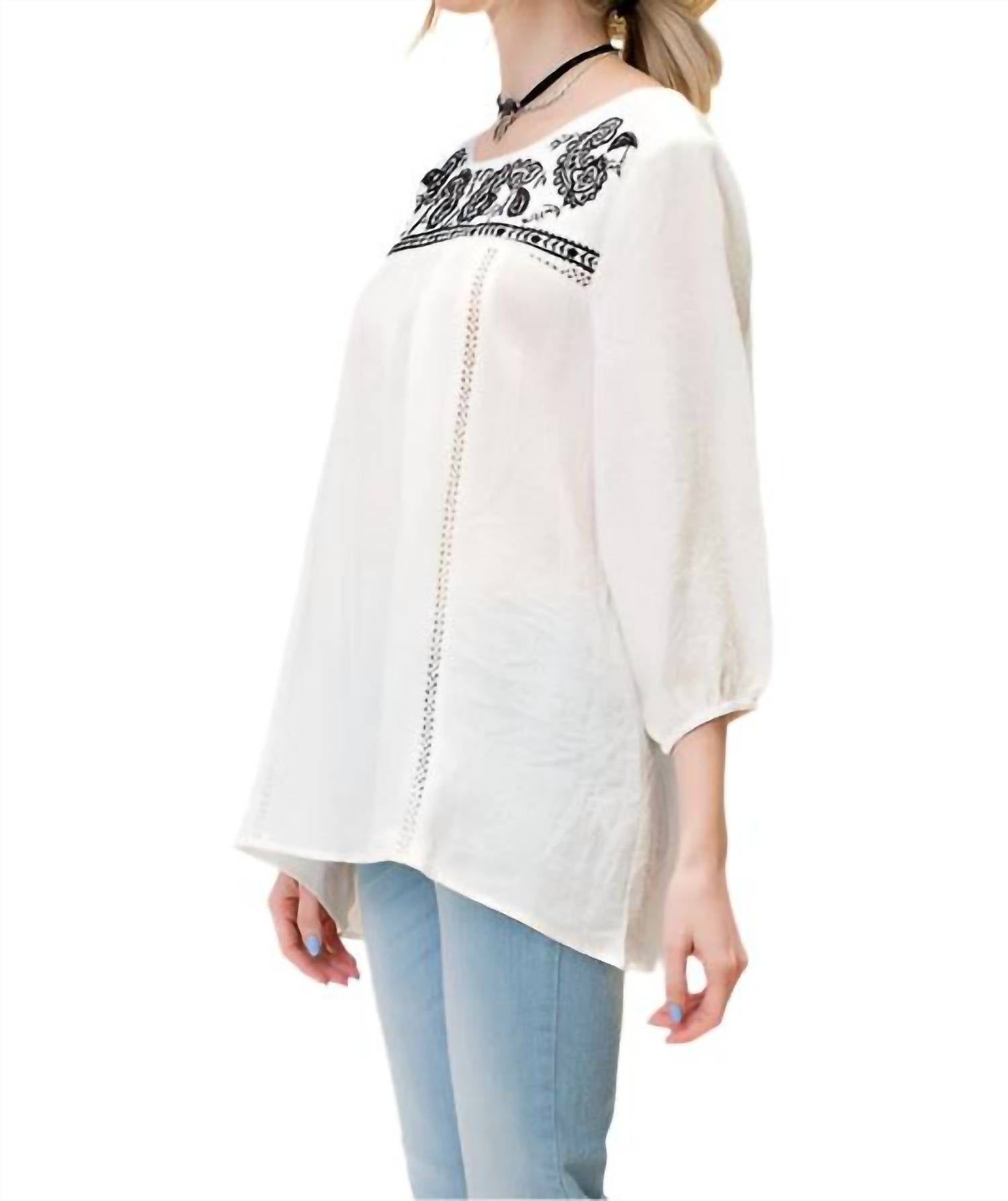 Универсальная блузка, которая подойдет и для работы, и для ужина! Представляем топ с вышивкой пейсли от KORI - великолепный выбор для летнего пляжного дня в стиле бохо-шик. Эта блузка с рукавами три четверти, эластичной, изысканной вышивкой и кружевной отделкой, и стильным асимметричным подолом. Состав: 80% вискоза, 20% нейлон. Застежка: одна пуговица сзади. Уход: ручная стирка в холодной воде, сушить на горизонтальной поверхности. Импортная модель. Доступна в размере Medium, обхват груди 44 дюйма (111 см), длина по переду 26 дюймов (66 см).