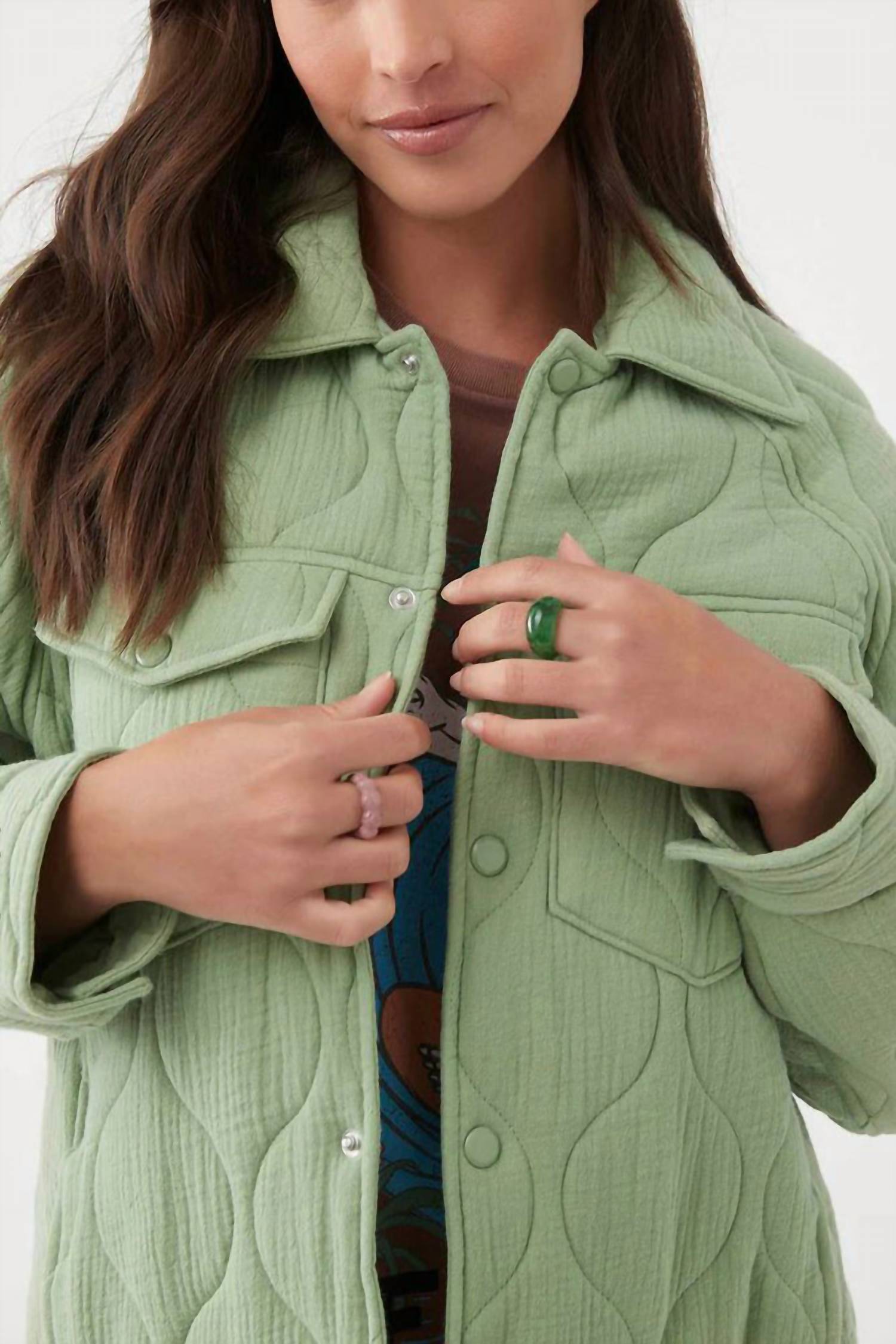 Прохладная погода - это повод для стильных пуховиков, и эта - настоящая находка для поклонников. Стеганая куртка Emet от O'NEILL - идеальный выбор для женщин, которые ценят комфорт и стиль в прохладные дни. Эта куртка цвета алоэ с длинными рукавами и свободным кроем тщательно сшита из 100% хлопка. Длина этой стеганой куртки с однотонным узором составляет 27 дюймов (72 см), она застегивается на удобные кнопки и пуговицы спереди, а также имеет функциональные накладные карманы. Инструкции по уходу: бережная ручная стирка и сушка на веревке.