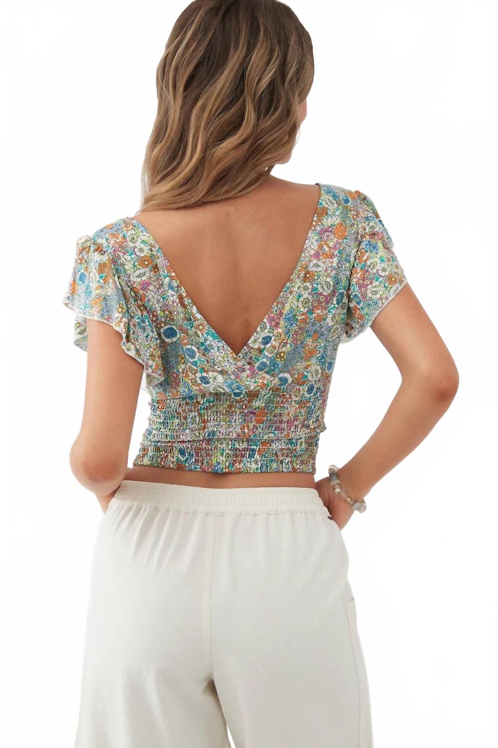 Универсальная блузка, которая подойдет как для работы, так и для ужина! Топ O'NEILL Bonnie станет ярким дополнением к вашему летнему гардеробу благодаря разноцветному цветочному узору в стиле бохо-шик. Эта женская блузка с короткими рукавами-крылышками и привлекательным V-образным вырезом с присборкой идеально подойдет для отпуска. Верх облегающей длины из 100% вискозы обеспечивает комфорт и непринужденный элегантный вид. Благодаря свободному крою, сборкам на спине и принту по всей длине, она станет отличным дополнением к любому наряду.