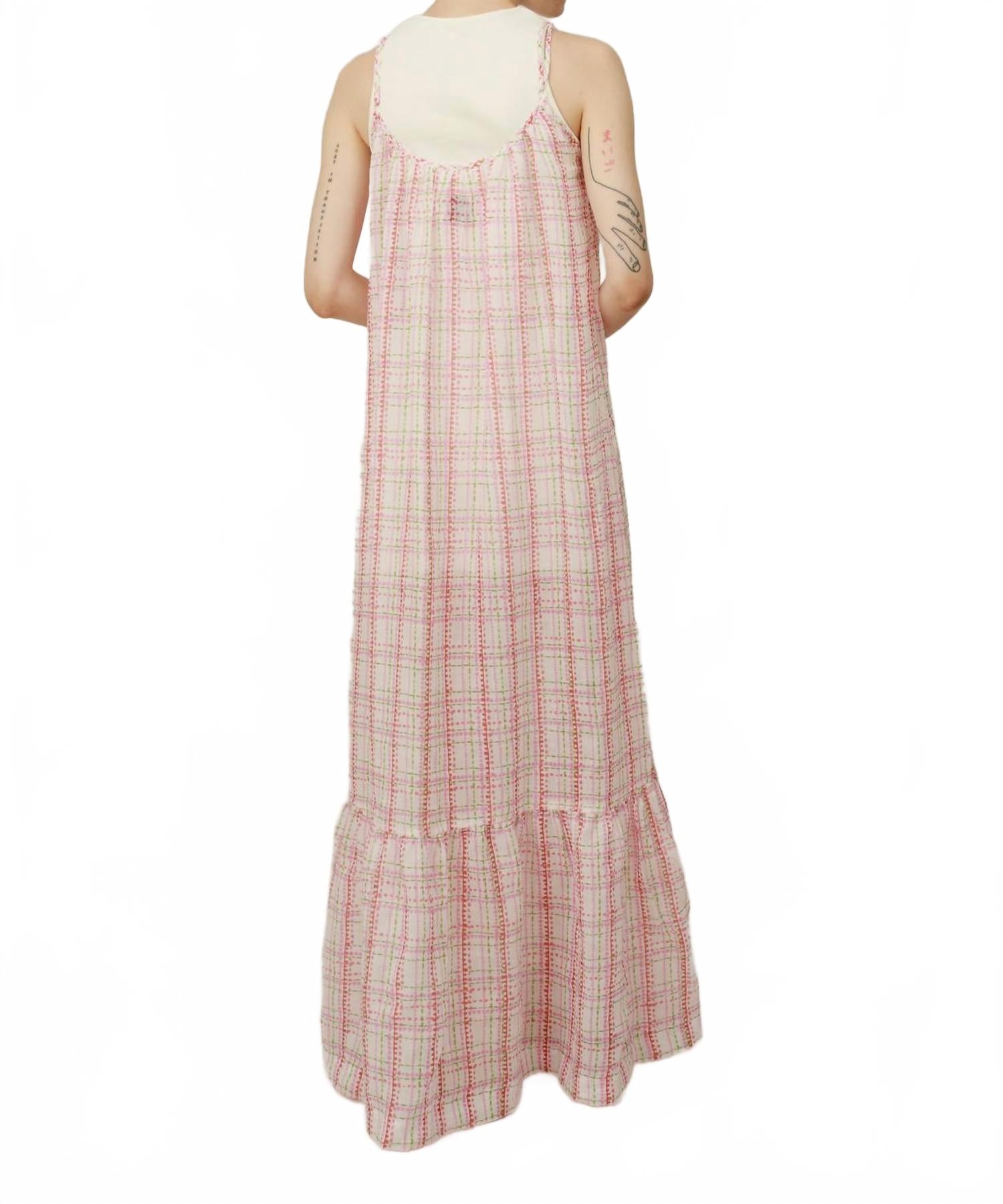 Кто не любит хорошее макси-платье? Это платье, которое вы будете носить сезон за сезоном. Откройте для себя мир универсальной одежды с платьем-макси из органзы от Project Adamo. Это платье без рукавов с круглым вырезом и очаровательным кремовым принтом в розово-красную клетку. Платье изготовлено из 100% хлопка и дополнено мини-комбинацией из 100% льна. Длина макси обеспечивает комфорт и стиль. Это платье, созданное для летних случаев, таких как дни рождения или День матери, воплощает сдержанную роскошь благодаря своему свободному силуэту.