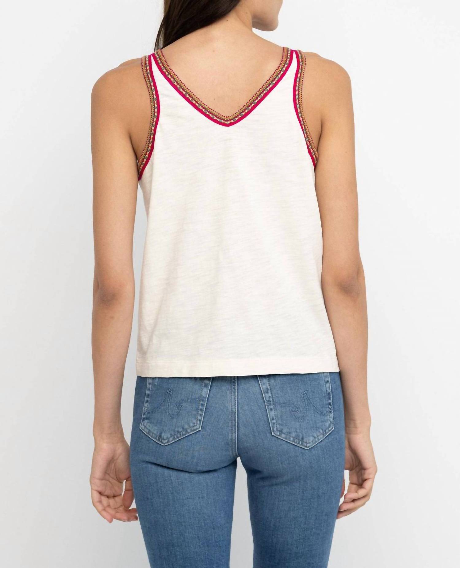Эта классическая майка идеально подходит для многослойной одежды и достаточно симпатична, чтобы носить ее отдельно. Представляем майку In A Tizzy от Лизы Тодд из 100% хлопка, дышащую и комфортную в течение всего дня. Эта майка без рукавов с V-образным вырезом в оттенке «Puff» украшена очаровательной контрастной вышивкой по вырезу и центру переда, что добавляет нотку бохо-шика. Выполненная в однотонном узоре, она легко надевается благодаря застежке-липучке. Эта майка идеально подходит для летнего отдыха и воплощает непринужденный стиль.
