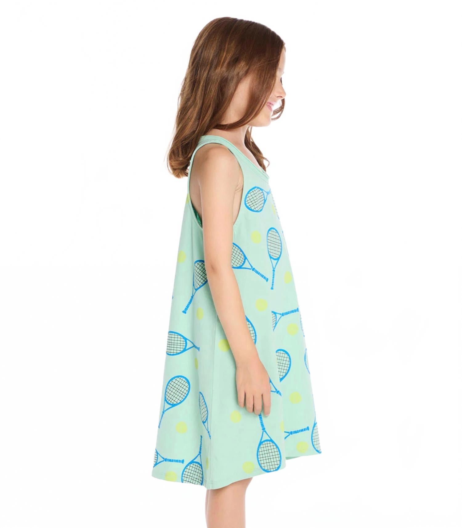 Представляем платье Chaser Tank Dress Tennis - летнее платье яркого зеленого цвета, идеально подходящее юным теннисисткам. Это платье А-силуэта без рукавов с игривым рисунком в виде теннисных ракеток и мячей сочетает в себе комфорт и спортивный стиль. Изготовленное из 100% хлопка, оно обеспечивает дышащую посадку и идеально подходит для повседневных прогулок или отдыха. Уход прост: стирайте в стиральной машине на деликатном режиме и сушите на горизонтальной поверхности, чтобы платье было готово к следующему матчу. На модели размер 6T.