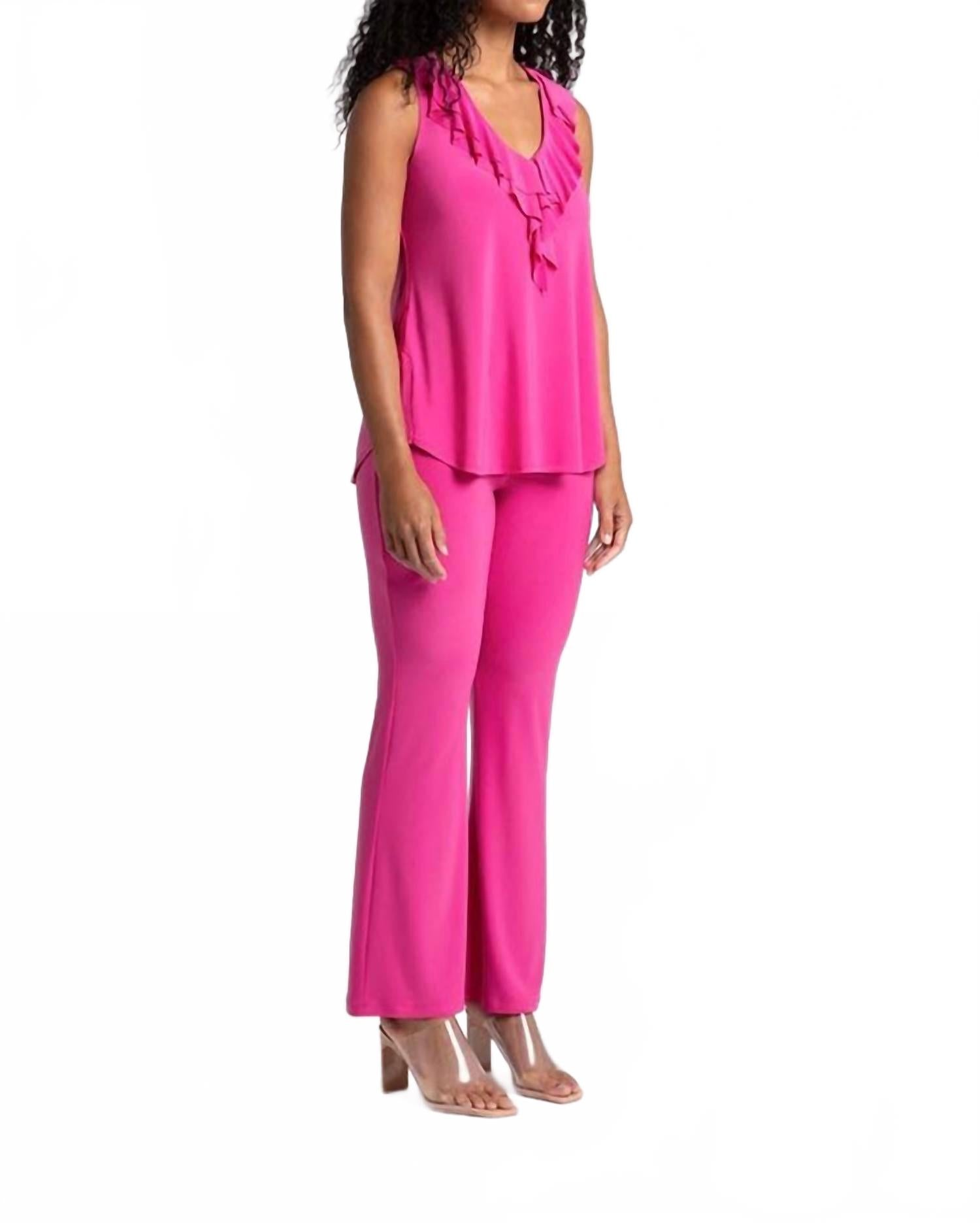 Сочетайте эту модель с любимыми джинсами и шлепанцами для следующего девичника. Представляем топ без рукавов Flutter от Sympli - элегантное дополнение к любому летнему гардеробу в очаровательном цвете пиона. Эта женская блузка украшена оборками-крылышками вокруг V-образного выреза и слегка закругленным подолом, идеально подходящим к любому наряду. Сделано в Канаде из смеси 94% полиэстера и 6% спандекса, это однотонное изделие сочетает в себе комфорт и стиль. Застежка: надевать. Уход: машинная стирка в холодной воде, сушить на веревке.