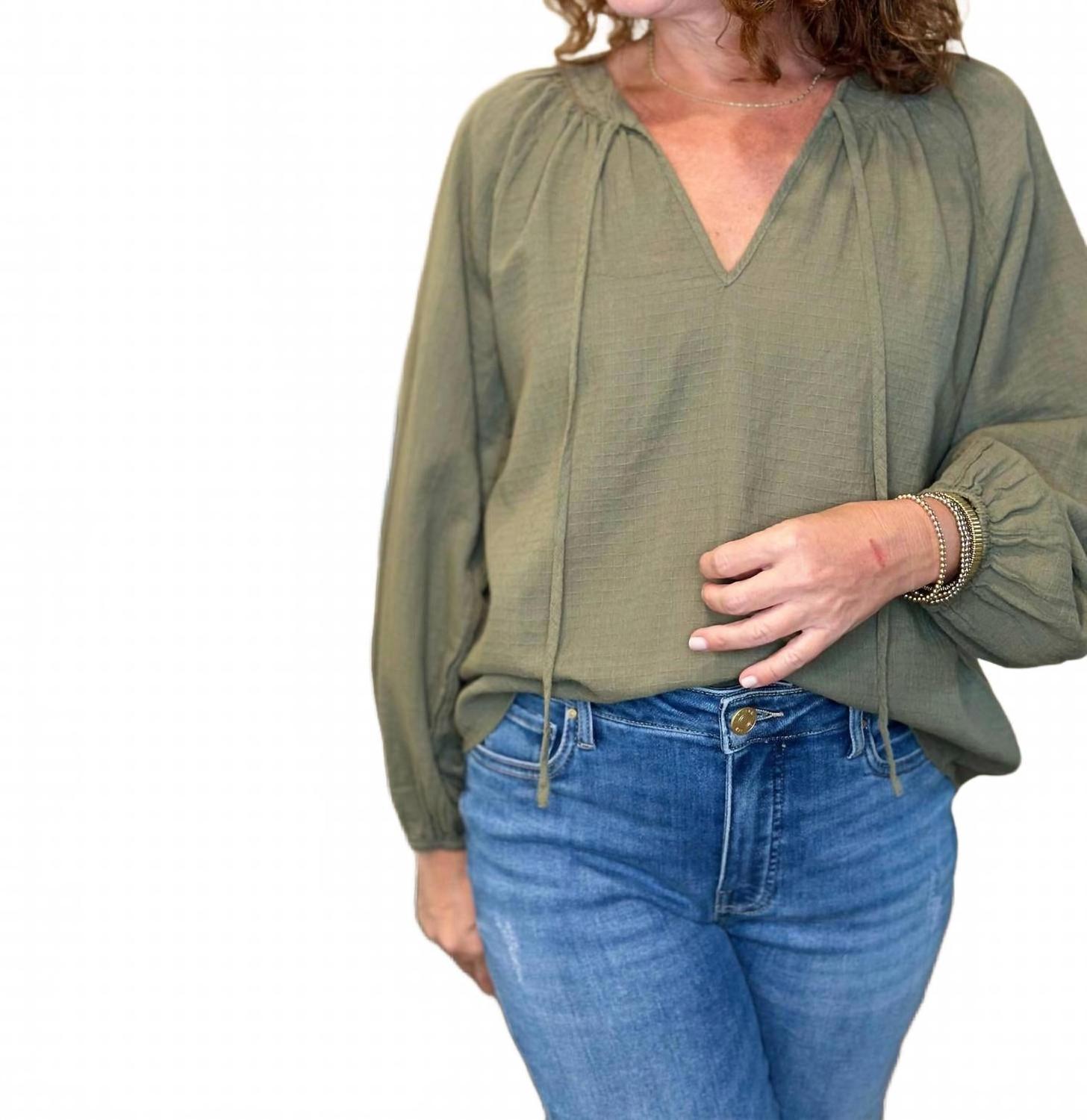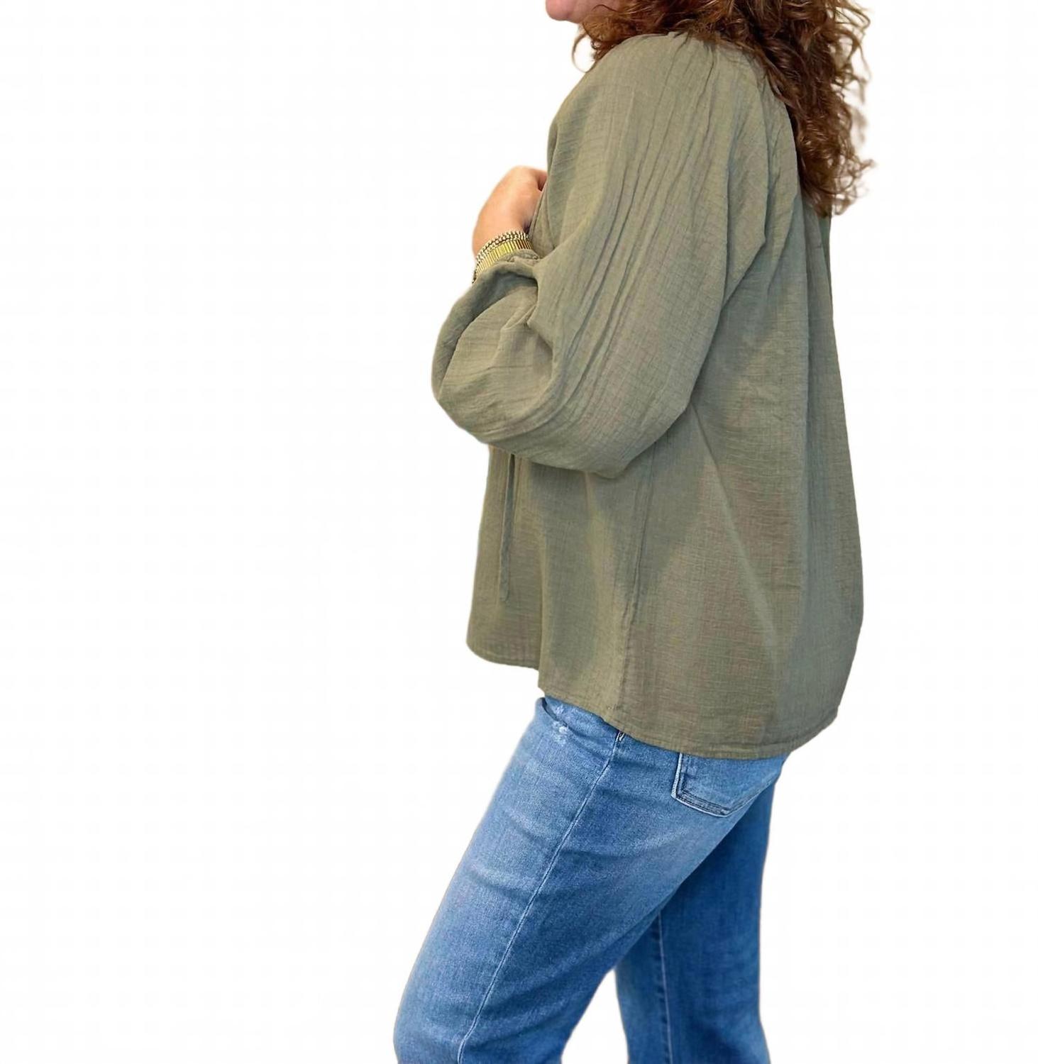 Универсальная блузка, которая подойдет как для работы, так и для ужина! Ощутите непринужденное очарование женской блузки Dylan's Poet насыщенного оливкового оттенка. Эта блузка с длинными рукавами, изготовленная из 100% хлопка, идеально подходит для летнего повседневного ношения и отпуска. Благодаря привлекательному V-образному вырезу и застежке-липучке, она стильная и удобная. Уход: машинная стирка в холодной воде на деликатном режиме и сушка в стиральной машине при низкой температуре. Модель Кэтлин ростом 160 см носит размер S.