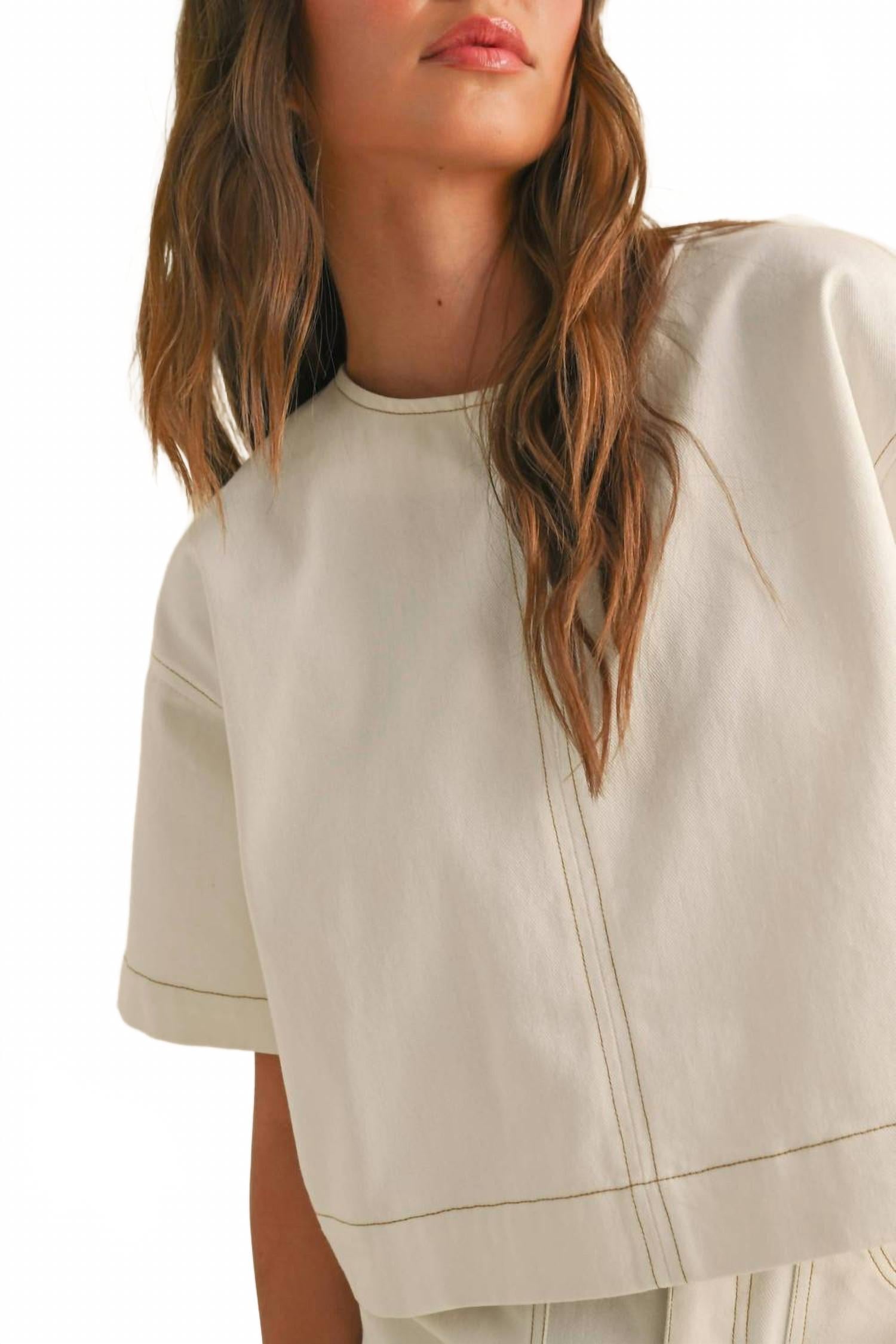 Откройте для себя топ Kiki Boxy Cotton Top от MIOU MUSE - стильный выбор для минималистичного летнего образа. Эта блузка цвета экрю с короткими рукавами и круглым вырезом выполнена из мягкого хлопка и обеспечивает удобный свободный крой. Контрастная строчка добавляет стильный штрих, а застежка-молния сзади обеспечивает удобство при надевании. Инструкция по уходу: машинная стирка. Идеально подходит для званых ужинов и романтических случаев, таких как День святого Валентина.